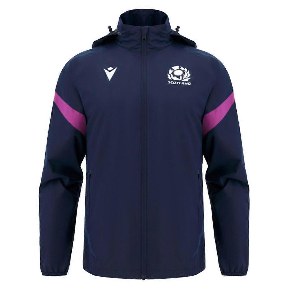 Keep your young rugby fan dry and comfortable with this official Scottish Rugby junior rain jacket from Macron. Designed for the 2025/26 season, this essential piece of kit ensures junior supporters can show their pride regardless of the weather.Key Features:Official Scottish Rugby merchandise for the 2025/26 seasonWater-resistant fabric keeps out rain and windLightweight construction won\'t weigh them downFull-zip front with storm flap for enhanced protectionElasticated cuffs and hem for a secure fitSide pockets perfect for storing essentialsDistinctive Scottish Rugby branding and coloursPackable design for easy transport to matchesPerfect For:Match days at Murrayfield or local groundsTraining sessions in unpredictable weatherEveryday wear for proud Scottish Rugby supportersThis junior rain jacket combines Macron\'s quality craftsmanship with Scotland\'s rugby heritage, making it an essential addition to any young fan\'s wardrobe. Whether they\'re cheering from the stands or playing in the park, this jacket will keep them dry whilst showcasing their Scottish Rugby allegiance.