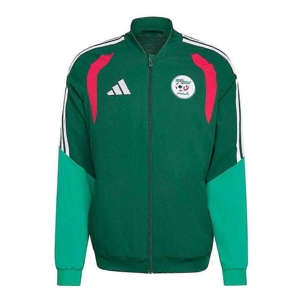 Show your support for the Fennecs in style with the Algeria 26/27 Presentation Jacket, part of the national-teams off-pitch range crafted by adidas. Designed for fans who want both heritage and performance, this jacket blends a sleek modern fit with traditional Algerian colours and clean detailing.Made from lightweight woven fabric for mobility and comfort, the presentation jacket features a full-zip front, stand-up collar and a tailored silhouette that looks smart whether at pre-match events, travelling, or just hanging out. The rich green colourway reflects Algerias national identity and pairs with subtle team branding for a premium finish. PersonalisationMake this jacket uniquely yours by adding a name and number on the back. The official-style printing ensures the customisation aligns with the national-team aesthetic for a professional, personalised look.Product DetailsOfficial Algeria 26/27 Presentation Jacket Style Code JZ0214Slim, athletic presentation fit for a clean silhouetteFull-zip front with stand-up collar for versatile wearLightweight woven fabric designed for movement and comfortSignature Algerian national-team green colourwayEmbroidered Algerian Football Federation crest and adidas brandingSuitable for official-style name & number personalisationMaterial: 100% Recycled PolyesterMachine washablePersonalisationTrainers Personalisation - Customise your item by adding your initials or squad number.