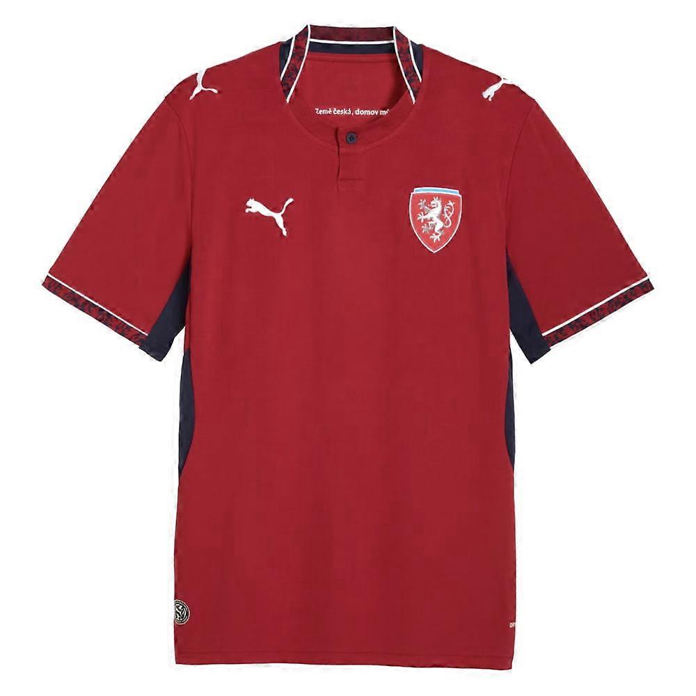 Show your support for the Czech national team in style with the official Czech Republic 2026 Puma Home Shirt. This striking jersey combines iconic national colours with cutting-edge performance technology, making it the perfect choice for passionate fans and football enthusiasts alike.Featuring the classic Czech red with subtle design details that pay homage to the nation\'s rich footballing heritage, this shirt represents a new era for the national squad. The Puma Cat logo and Czech Football Association crest are proudly displayed, whilst the modern athletic cut ensures both comfort and authentic team styling.Crafted from Puma\'s advanced moisture-wicking fabric, this shirt keeps you cool and dry whether you\'re cheering from the stands, playing a kickabout with mates, or simply wearing it as part of your everyday wardrobe. The breathable material and ergonomic fit provide unrestricted movement, whilst the durable construction ensures this shirt will last season after season.Key Features:Official Czech Republic national team home shirt for 2026Puma dryCELL technology for superior moisture managementEmbroidered Czech Football Association badgePuma Cat logo on the chestAthletic fit designed for comfort and performanceDurable, easy-care fabricPersonalisation AvailableMake this shirt truly your own by adding personalisation Choose your favourite player\'s name and number, or add your own name to the back for a unique touch. Perfect for showing individual support or creating a special gift for the Czech football fan in your life.PersonalisationName & Number - Customise your jersey with the name and number of your favourite Czech Republic player or even your own name. We can print name in the same style worn by the players.