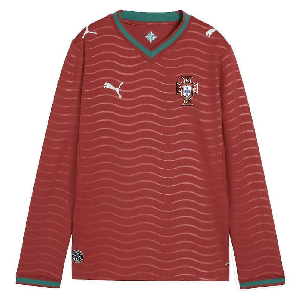 Dress your young football fan in the pride of Portuguese football with this stunning 2026 home shirt. Designed by Puma for the next generation of supporters, this long sleeve kit captures the essence of one of Europe\'s most exciting national teams.Product DetailsCrafted in Portugal\'s iconic deep red colourway, this official home shirt showcases the quality and style that Puma brings to international football. The long sleeves provide extra coverage for cooler matchdays or training sessions, whilst the breathable fabric ensures your child stays comfortable whether they\'re cheering from the stands or playing in the park.The shirt features Portugal\'s distinctive crest proudly displayed on the chest, alongside the unmistakable Puma logo. Every detail has been carefully considered to replicate what the players will wear as they represent their nation on the world stage.Personalisation AvailableMake this shirt truly special by adding your child\'s name and favourite number to the back. Whether they want to emulate their Portuguese heroes or proudly display their own identity, personalisation transforms this shirt from a replica into a treasured keepsake.Perfect ForYoung Portugal supportersJunior football training and matchesCasual wear for football-mad kidsGift-giving for birthdays or special occasionsBuilding a collection of international football shirtsBring home the passion and flair of Portuguese football. Order yours today and let your child wear their colours with pride.PersonalisationName & Number - Customise your jersey with the name and number of your favourite Portugal player or even your own name. We can print name in the same style worn by the players.