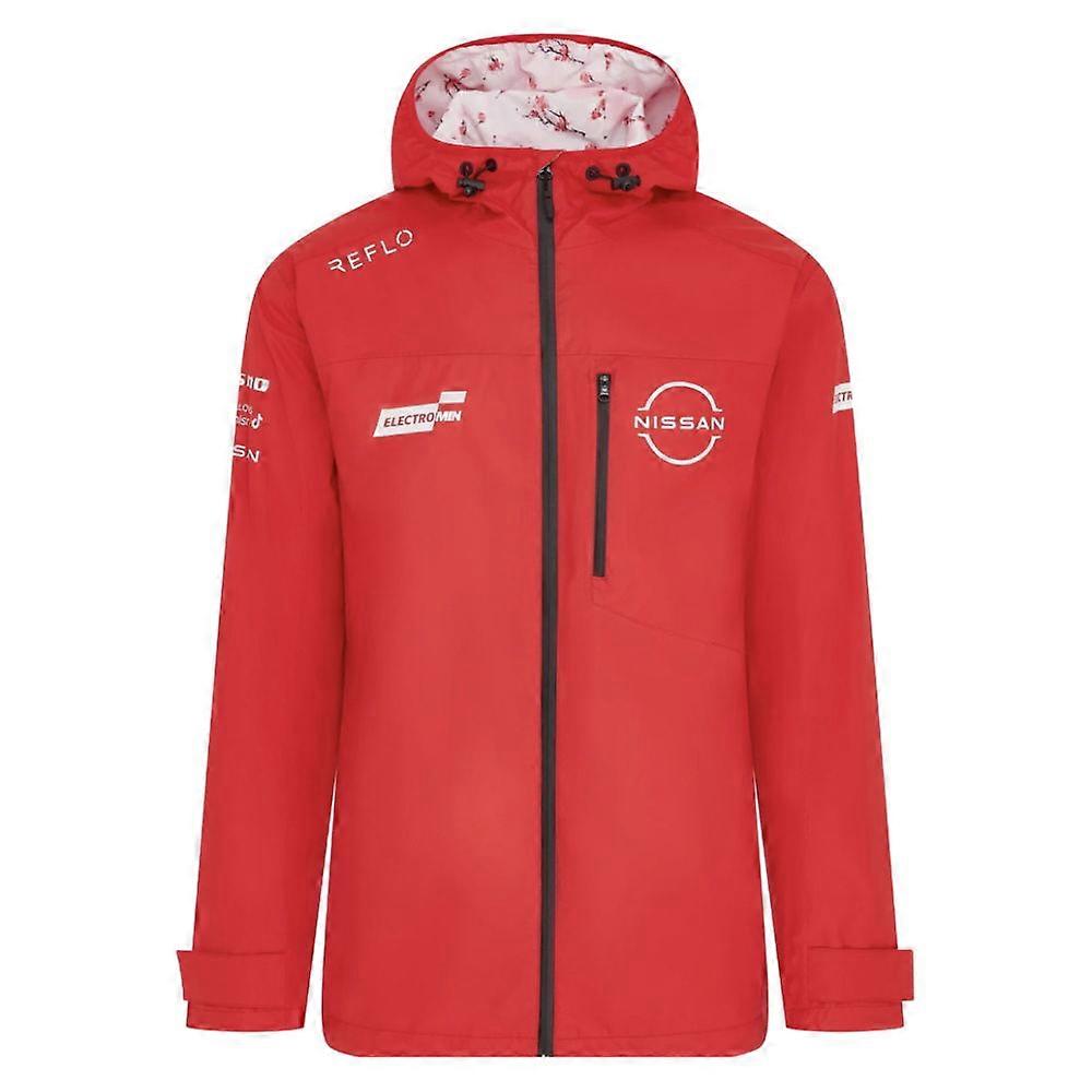 Stay dry and show your team pride with the official Nissan Formula E Rain Jacket for the 2025/26 season. This striking red waterproof jacket combines cutting-edge weather protection with authentic motorsport styling, making it essential kit for race day and beyond.Premium Weather ProtectionEngineered to keep you comfortable in British weather, this rain jacket features fully taped seams and water-resistant fabric that shields you from the elements whilst maintaining breathability. Whether you\'re trackside at the London E-Prix or commuting through a downpour, you\'ll stay dry and comfortable.Authentic Team DesignFinished in Nissan Formula E\'s signature red colourway, this jacket showcases the team\'s official branding and sponsor logos from the 2025/26 championship season. The sleek, athletic cut mirrors the team\'s performance-focused aesthetic, whilst practical features include an adjustable hood, secure zip pockets, and elasticated cuffs for a customised fit.