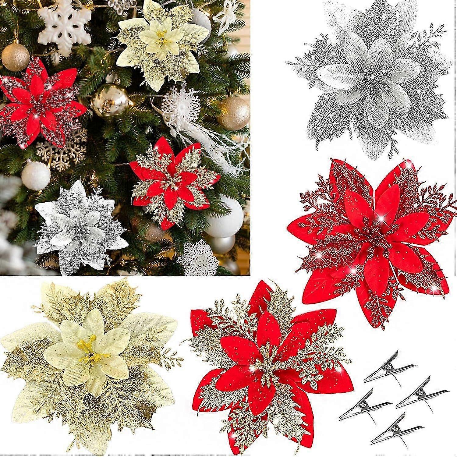20pcs Christmas Red Flowers Artificial Christmas Flowers with Clips 4 Colors Large Glitter Christmas Tree Decorations for Christmas