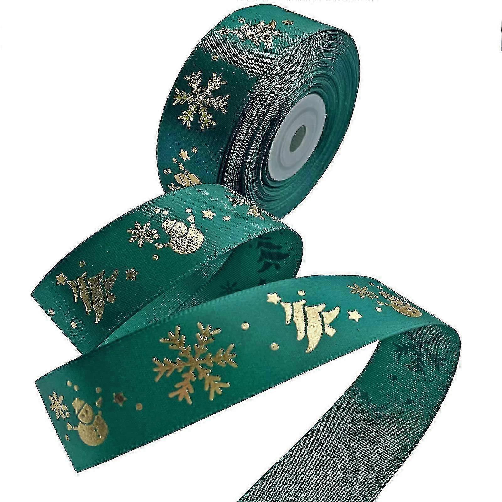 22 Meters Christmas Ribbon Satin Ribbons Printed with Golden Christmas Tree Snowman Snowflakes, Merry Christmas Ribbon for Decoration