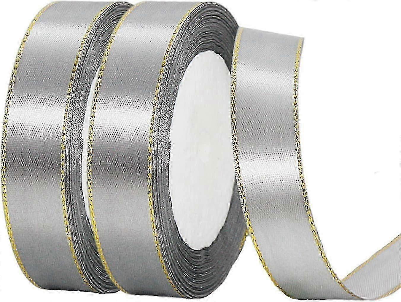 2Rolls 20mmx22m Grey Ribbon with Gold Rim,Christmas Double Sided Satin Ribbon Roll for Crafts DIY,Christmas Ribbon for Gift Wapping