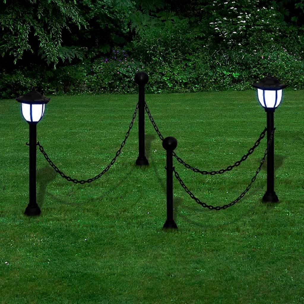 Diese Solarleuchten mit Kette sind eine perfekte Ergänzung zu Ihrem Garten oder der Terrasse. Jede Leuchte ist aus dauerhaftem Kunststoff hergestellt, sorgt damit für einen jahrelangen Gebrauch. Diese Solarlaternen laden sich bei Sonnenschein auf und leuchten nach Anbruch der Dämmerung. Die Beleuchtungsdauer hängt sich von dem Wetterzustand ab. Normalerweise können sie nach 3-stunden Sonneneinstrahlung etwa 8 Stunden leuchten. Da die Batterie durch Sonneneinstrahlung aufgeladen wird, verbraucht die Gartenleuchte keine Elektroenergie, spart daher Ihre Stromkosten. Und ohne Kabel wird ein sicherer Einsatz und bequemer Transport gewährleistet. Schwarzer PP/Material, haltbarer Kunststoff, stoßfest, UV-beständig1 kaltweiß 0,1 W LED je StückLaternenhöhe: 70 cmHöhe des Pfeilers: 55 cmEnergiequelle: SolarBatterie: 1x vormontierte, wiederaufladbare AA, 1,2V / NI-MH 600mAh für jede LeuchteDas Set enthält:2 x Solarlampe mit Pfosten und Erdspießen2 x Pfeiler mit Erdspießen3 x 1 m Kette2 x AA 1,2V / NI-MH 600mAh