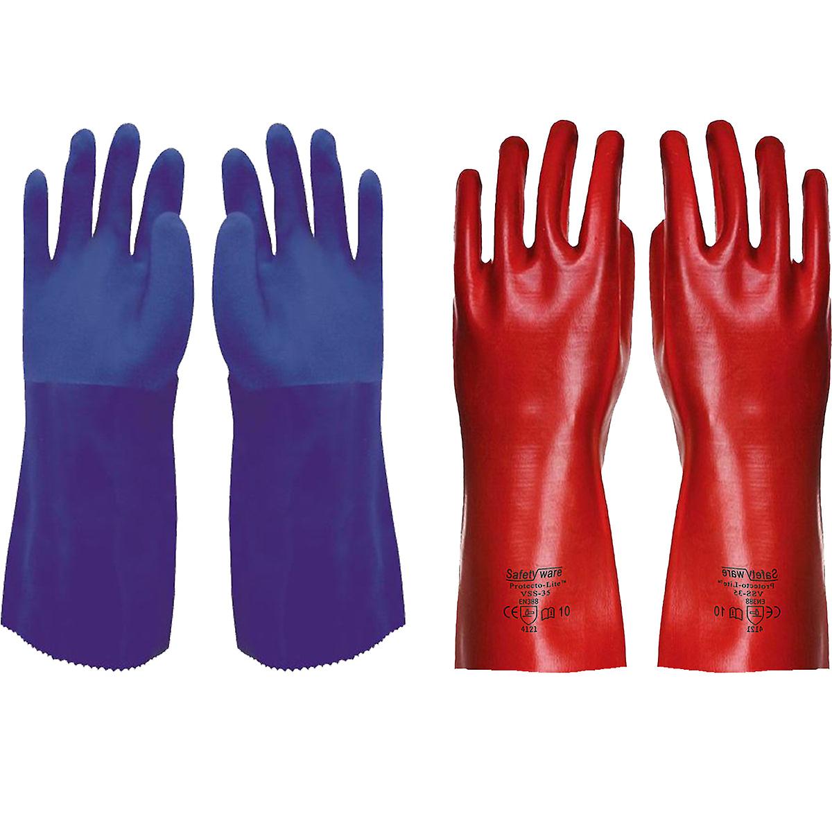 2X Safetyware Dipped Pvc Gauntlet Work Gloves Blue Red Chemical Resistant 35cm For Kitchen Cleaning Oil Dishwashing Mechanic Work General Purpose