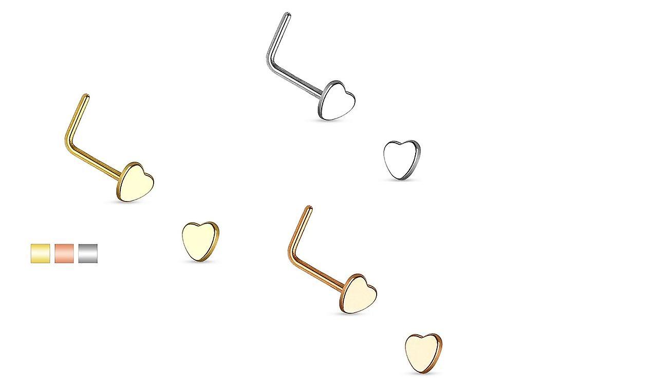 3 pack Nose Piercing Stud L Shape 20G with Heart Shape Design Description Features a cute heart on the topYou get all 3 colors: Gold, Silver and Rose GoldShaft measures 20g with an overall length of 1/4"(6 mm)