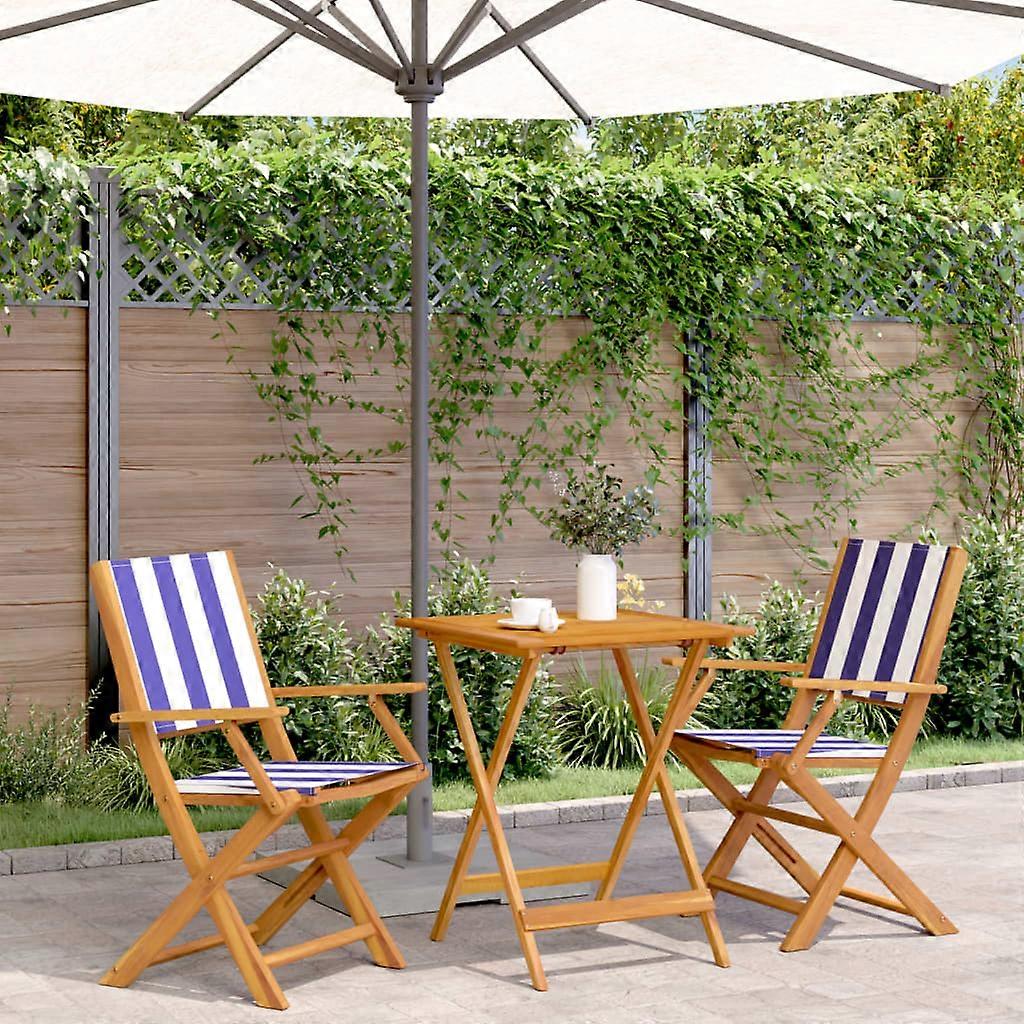 Tisch:Material: Akazien-Massivholz, mit Öl behandeltAbmessungen: 60 x 60 x 75 cm (L x B x H)ZusammenklappbarGartenstuhl:Farbe: Blau und WeißMaterial: Massives Akazienholz mit Öl-Finish, Stoff (100% Polyester)Abmessungen: 54 x 58 x 91 cm (B x T x H)Sitzgröße: 40 x 38 cm (B x T)Sitzhöhe vom Boden: 44 cmArmlehnenhöhe vom Boden: 63 cmMaximale Tragfähigkeit (pro Sitz ): 110 kgKissen inbegriffen: NeinZusammenbau erforderlich: JaLieferung umfasst:1 x Gartentisch2 x Gartenstuhl