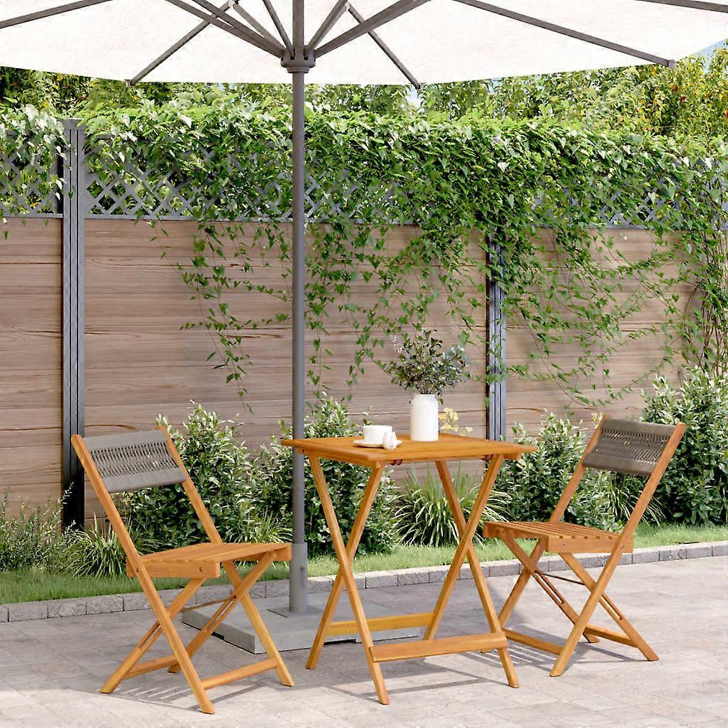 Genieße eine Tasse Kaffee oder unterhalte dich mit deiner Familie und deinen Freunden im Garten, Hinterhof oder auf dem Balkon mit diesem Bistro-Set Robust und stabil: Massives Akazienholz ist für seine Festigkeit und Haltbarkeit bekannt. Seine vielfältige Farbe und seine einzigartige Maserung verleihen ihm eine attraktive Optik. Dank seiner ausgezeichneten Stabilität und Witterungsbeständigkeit eignet es sich ideal für die Herstellung von Innen- und Außenmöbeln.Praktisches Design: Der Outdoor-Stuhl hat keine Armlehnen und verfügt nur über eine Rückenlehne, um mehr Bewegungsfreiheit und dennoch hohen Komfort zu genießen.Robuste Tischplatte: Der Gartentisch bietet den idealen Platz für deine Getränke, Snacks, Obstkörbe oder Lieblingsdekorationen.Klappdesign: Der Garten-Esstisch und die Stühle lassen sich bei Nichtgebrauch einfach zusammenklappen, um die Lagerung und den Transport zu erleichtern. Gut zu wissen:Wir empfehlen dir, deine Gartenmöbel mit einer wasserdichten Hülle zu schützen, um lange Zeit eine ansprechende Optik aufzuweisen. Tisch:Material: Akazien-Massivholz, mit Öl behandeltAbmessungen: 60 x 60 x 75 cm (L x B x H)ZusammenklappbarGartenstuhl:Farbe: GrauMaterial: Massives Akazienholz mit Öl-Finish, PolypropylenAbmessungen: 41 x 52,5 x 80 cm (B x T x H)Sitzgröße: 38 x 32,5 cm (B x T)Sitzhöhe vom Boden: 44 cmMaximale Tragfähigkeit (pro Sitz ): 110 kgKissen inbegriffen: NeinZusammenbau erforderlich: JaLieferung umfasst:1 x Gartentisch2 x Gartenstuhl