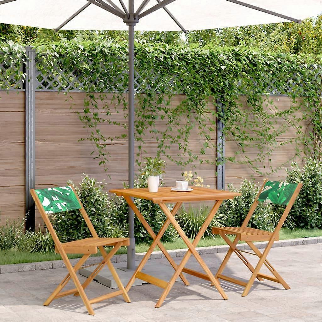 Genieße eine Tasse Kaffee oder unterhalte dich mit deiner Familie und deinen Freunden im Garten, Hinterhof oder auf dem Balkon mit diesem Bistro-Set Robust und stabil: Massives Akazienholz ist für seine Festigkeit und Haltbarkeit bekannt. Seine vielfältige Farbe und seine einzigartige Maserung verleihen ihm eine attraktive Optik. Dank seiner ausgezeichneten Stabilität und Witterungsbeständigkeit eignet es sich ideal für die Herstellung von Innen- und Außenmöbeln.Praktisches Design: Der Outdoor-Stuhl hat keine Armlehnen und verfügt nur über eine Rückenlehne, um mehr Bewegungsfreiheit und dennoch hohen Komfort zu genießen.Robuste Tischplatte: Der Gartentisch bietet den idealen Platz für deine Getränke, Snacks, Obstkörbe oder Lieblingsdekorationen.Klappdesign: Der Garten-Esstisch und die Stühle lassen sich bei Nichtgebrauch einfach zusammenklappen, um die Lagerung und den Transport zu erleichtern. Gut zu wissen:Wir empfehlen dir, deine Gartenmöbel mit einer wasserdichten Hülle zu schützen, um lange Zeit eine ansprechende Optik aufzuweisen. Tisch:Material: Akazien-Massivholz, mit Öl behandeltAbmessungen: 70 x 70 x 75 cm (L x B x H)ZusammenklappbarGartenstuhl:Farbe: GrünMaterial: Massives Akazienholz mit Öl-Finish, Stoff (100% Polyester)Abmessungen: 41 x 52,5 x 80 cm (B x T x H)Sitzgröße: 38 x 32,5 cm (B x T)Sitzhöhe vom Boden: 44 cmMaximale Tragfähigkeit (pro Sitz ): 110 kgMit BlattmusterKissen inbegriffen: NeinZusammenbau erforderlich: JaLieferung umfasst:1 x Gartentisch2 x Gartenstuhl