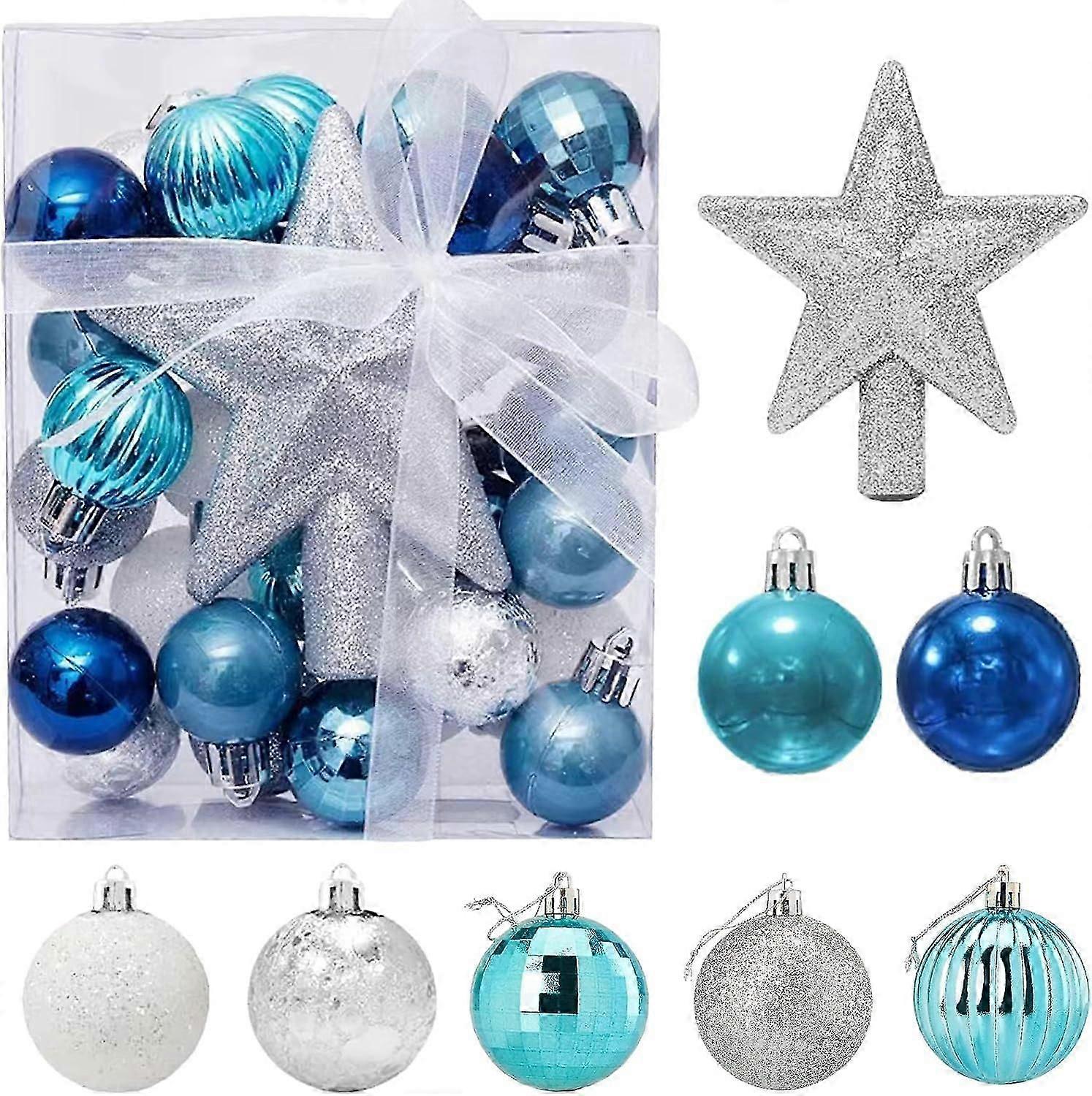 Mini Christmas bauble set - 29 blue and silver baubles (3 cm) and 1 gold star (10.5 cm). These bauble ornaments are in 7 styles: blue spiral 4, blue mirror 4, blue smooth 4, matte blue 5, silver glitter 4, smooth silver 4, white glitter 4. The 30 mini Christmas baubles contain everything you need.Ideal for the Christmas tree Table Christmas - The Christmas baubles are really small, measuring 3 cm and are specially designed for small Christmas trees. Perfect for any full-sized tree in the 30-90 CM range.Easy to use - Each Christmas bauble comes with a gold or silver ribbon that can be easily hung on the Christmas tree, which is the most popular ball ornament!More durable: Made of plastic, this Christmas ball is not easy to fade and can be reused. The product comes in a convenient transparent box for easy storage after purchase, you can also send them as a gift.Merry Christmas: These bright color decorations for filling use white and color main Christmas tree decorations, can be used to bring you a strong Christmas atmosphere, so if you want a complete set of mini Christmas tree decorations for cheap, you are in the right place.