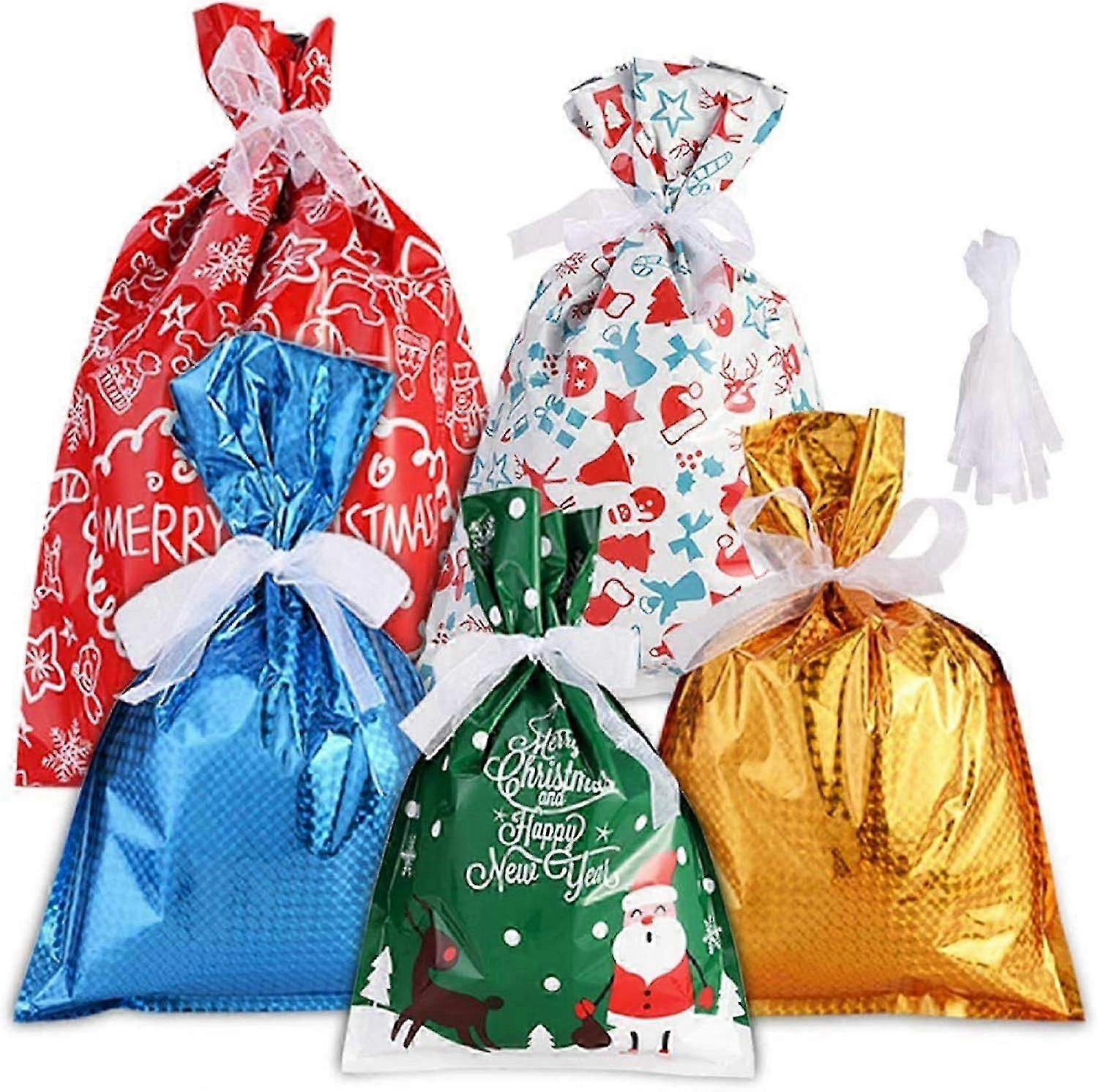 30PCS Christmas Gift Bags, Plastic Christmas Gift Bags with 30 Packing Ribbon for Christmas Decoration and Gift Wrapping