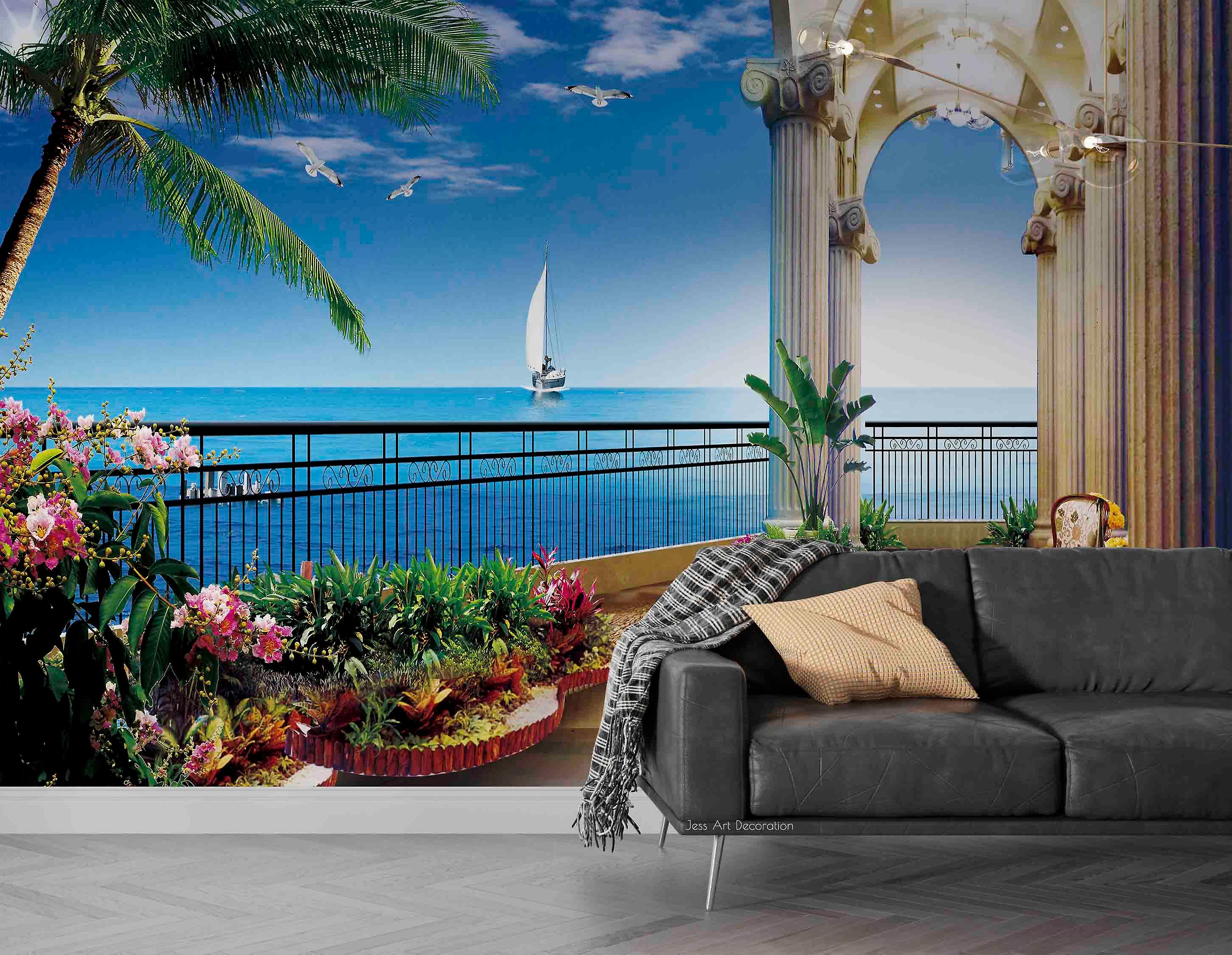3D Blue Ocean Sailboat Coconut Tree Roman Architecture Wall Mural Wallpaper