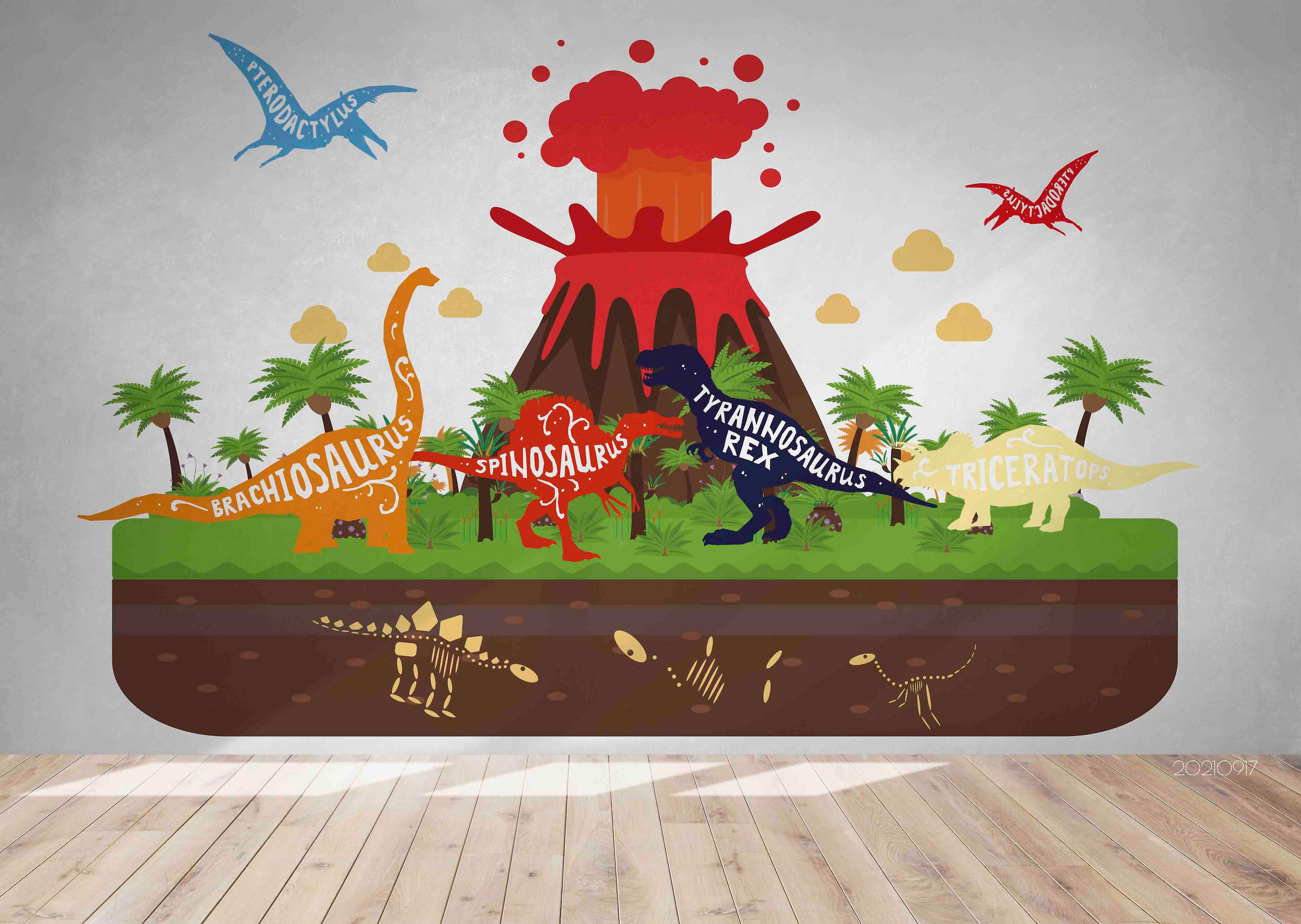 3D Cartoon Volcano Animal Dinosaur Wall Mural Wallpaper Lqh 106