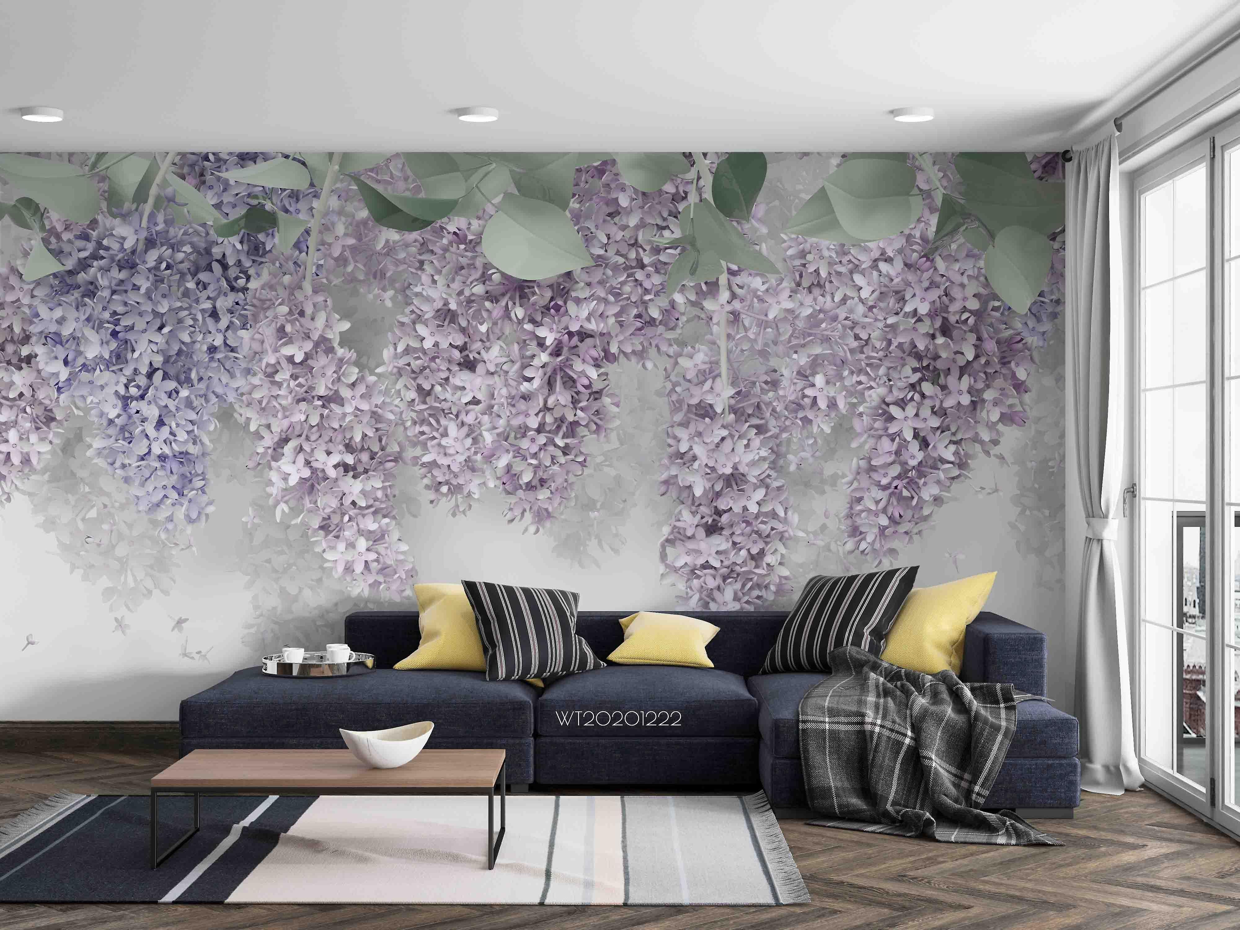 3D Hand Drawn Purple Floral Leaf Wall Mural Wallpaper Lqh 165