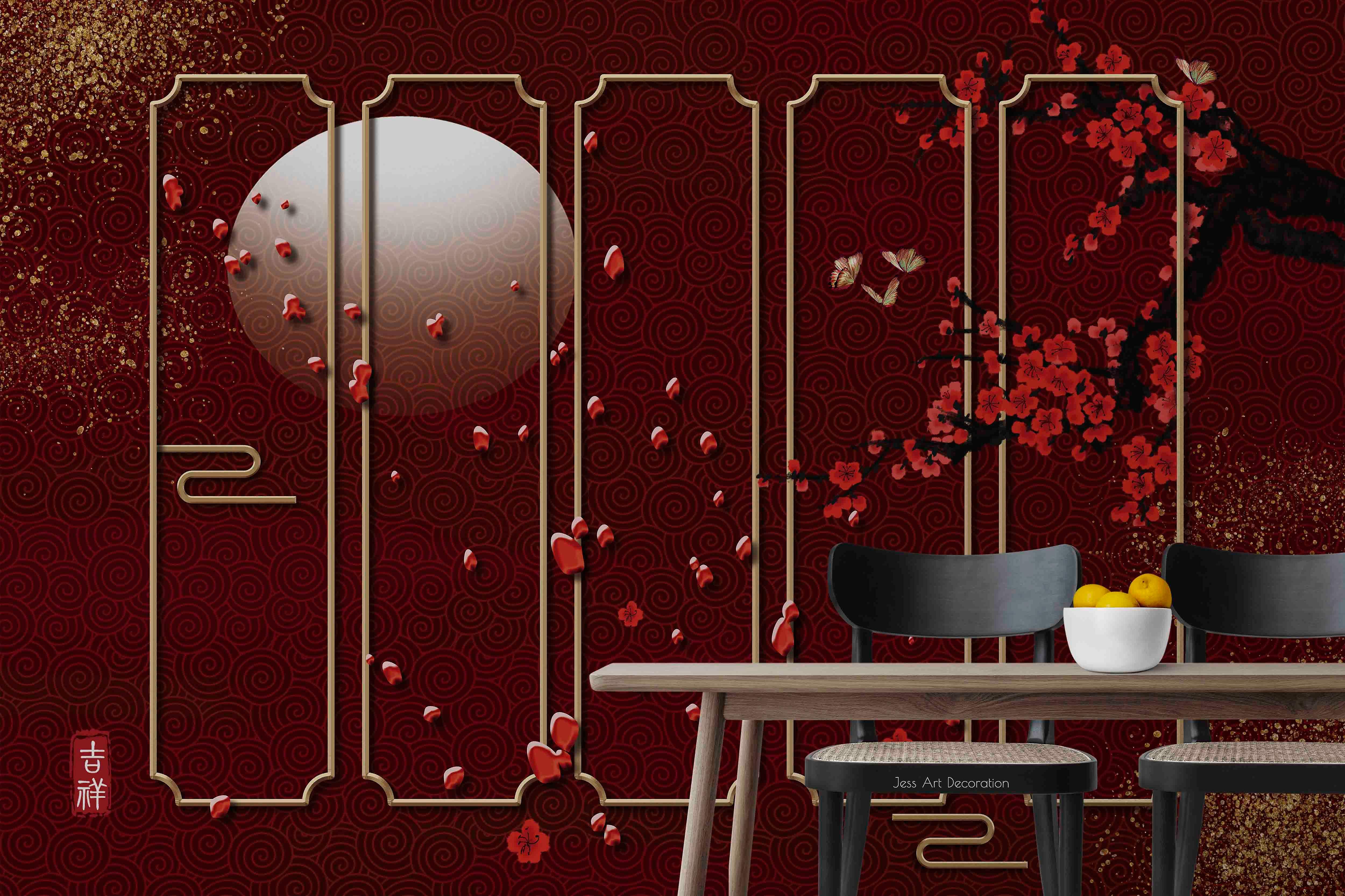 3D New Chinese Style Red Plum Blossom Full Moon Geometric Wall Mural Wallpaper