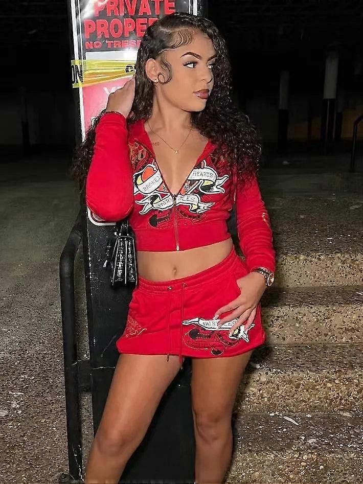 3d Pattern Skirt Set: Hooded Zipper Top & Drawstring Short Skirt