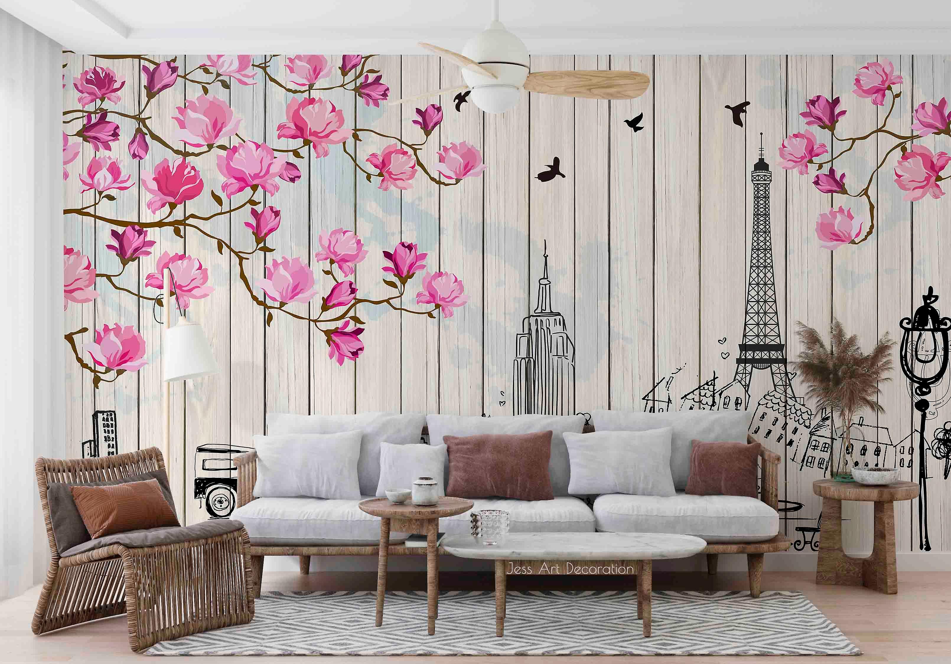 3D Pink Magnolia Building Tower Wooden Board Wall Mural Wallpaper Gd 2927