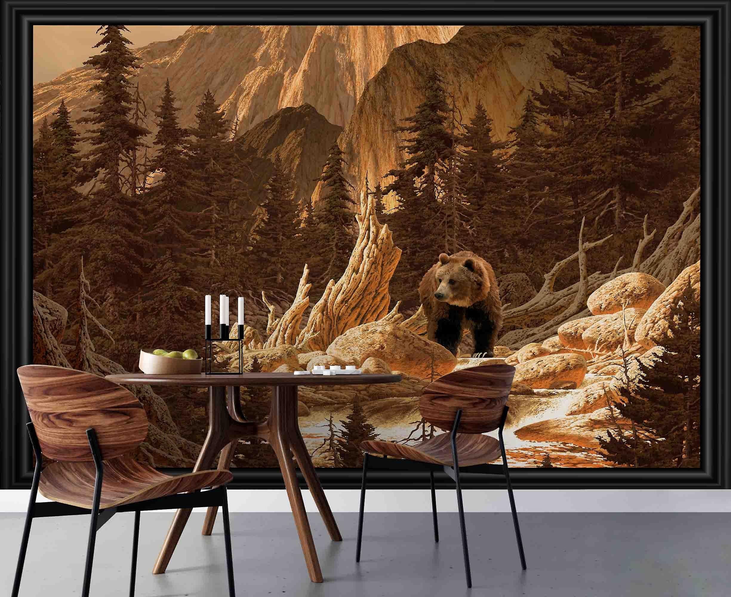 3D Sunshine Pine Forest Mountain Cliff Bear Wall Mural Wallpaper