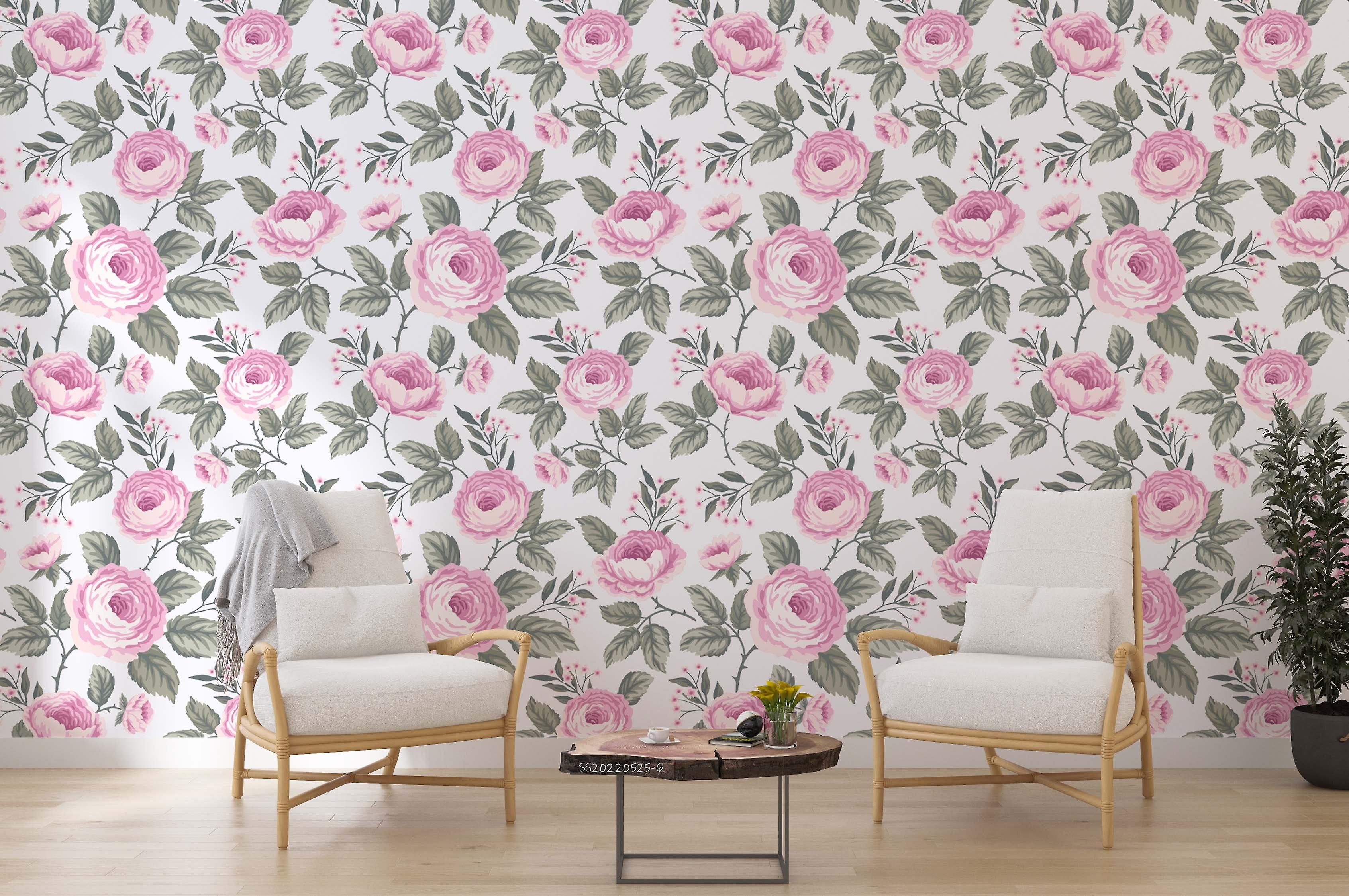 3D Watercolor Pink Rose Floral Green Leaves Wall Mural Wallpaper Gd 1317