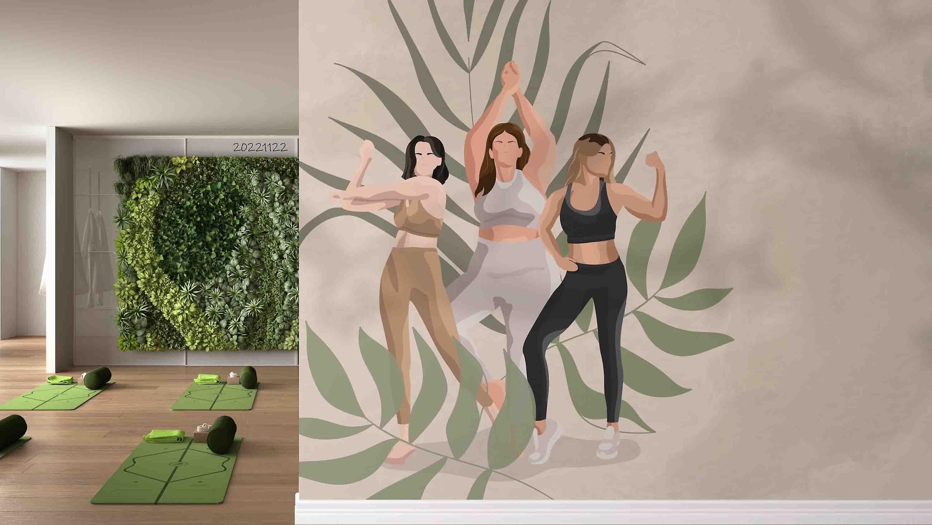 3D Women Yoga Fitness Lifestyle Leaves Background Wall Mural Wallpaper Gd 2488