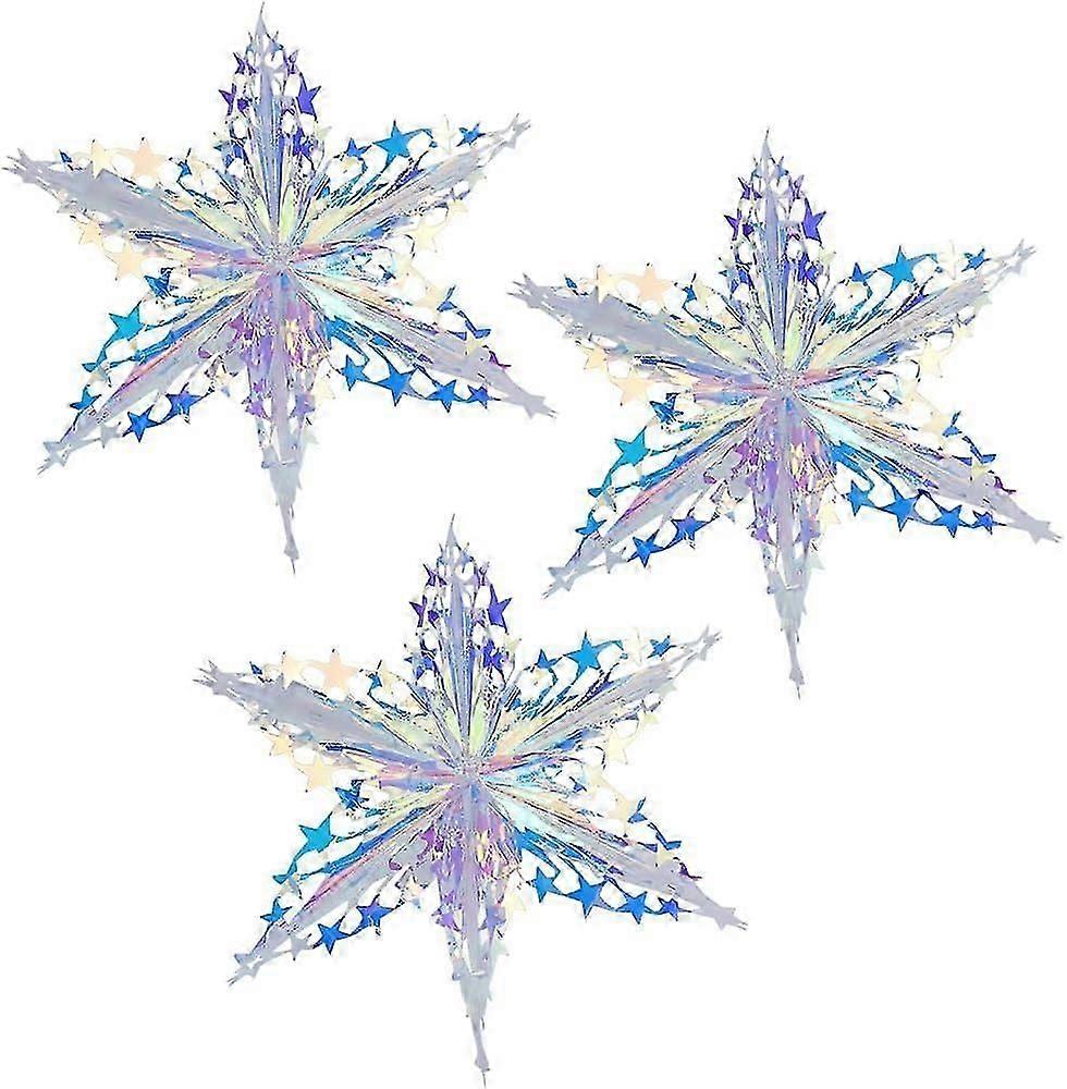 3PCS Iridescent Snowflake Hanging Ornament Star Flower Ball Holographic Clear Foil Ceiling Decoration Plastic Rainbow Shine Folding Decor for Bridal S