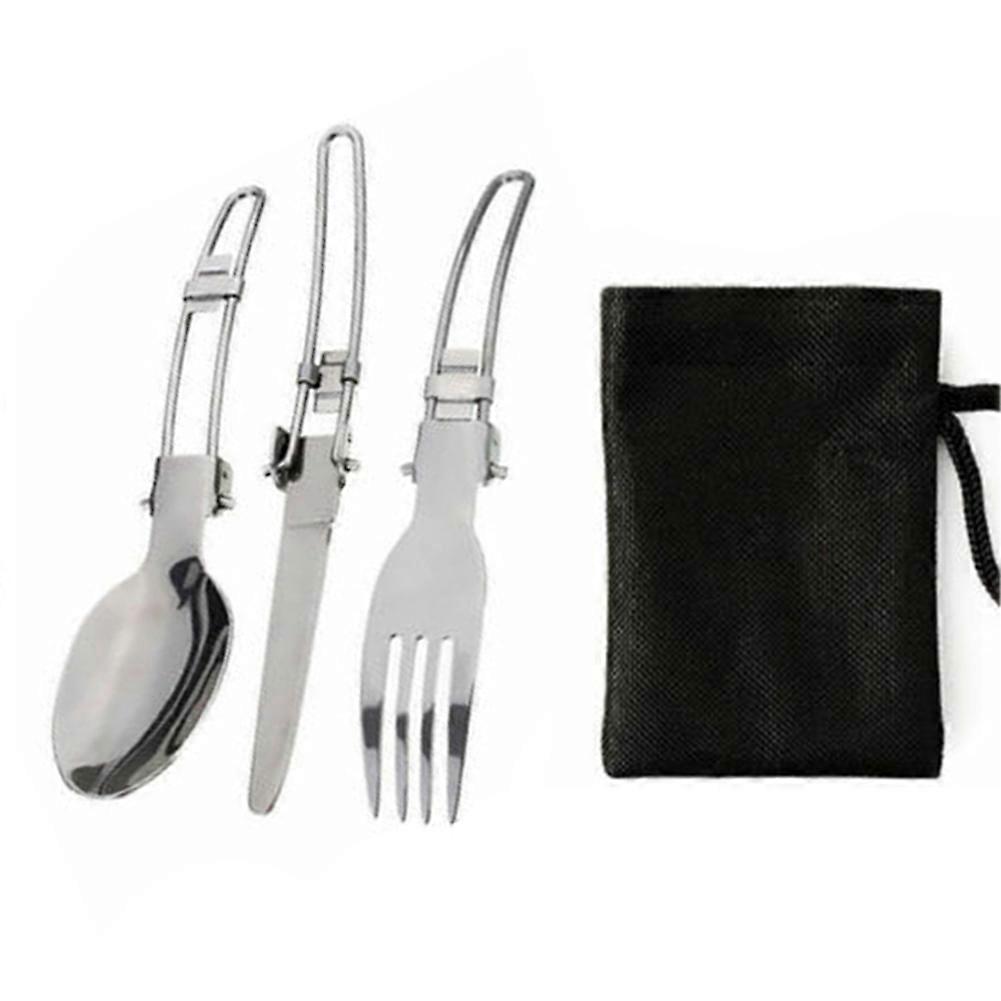 3Pcs Stainless Steel Folding Camping Spoon Fork Knives Cutlery Set + Bag Folding Picnic Cutlery Travel Set Dishes