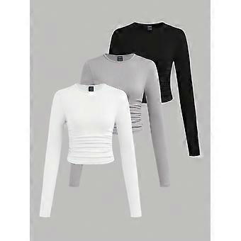 3pcs/Set Women's Casual Solid Color Crew Neck Ruched Long Sleeve T-Shirts, Autumn/Winter