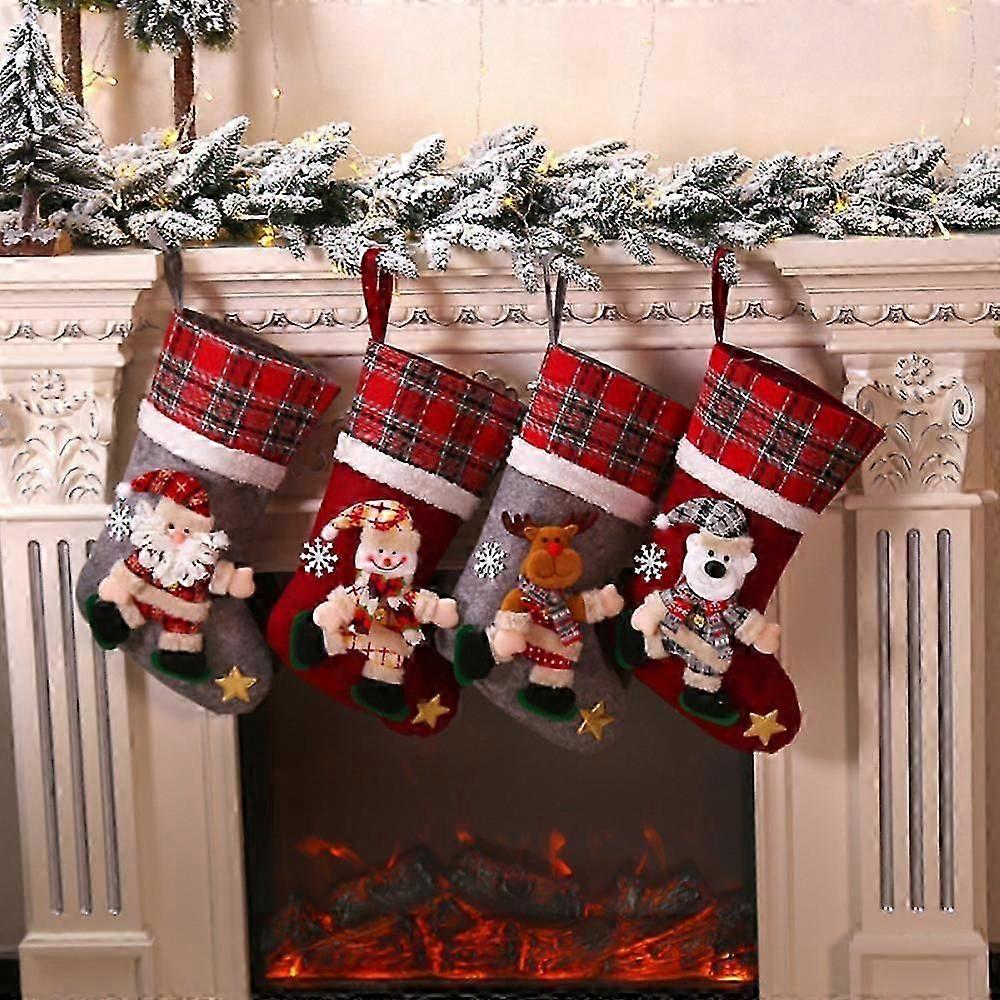 4 PCS Christmas Socks Decoration, Hang Ornaments Socks Candy Bag Seasonal Decor for Fireplace, Xmas Tree, Gift Candy Pouch Bag with Buffalo Plaid, San