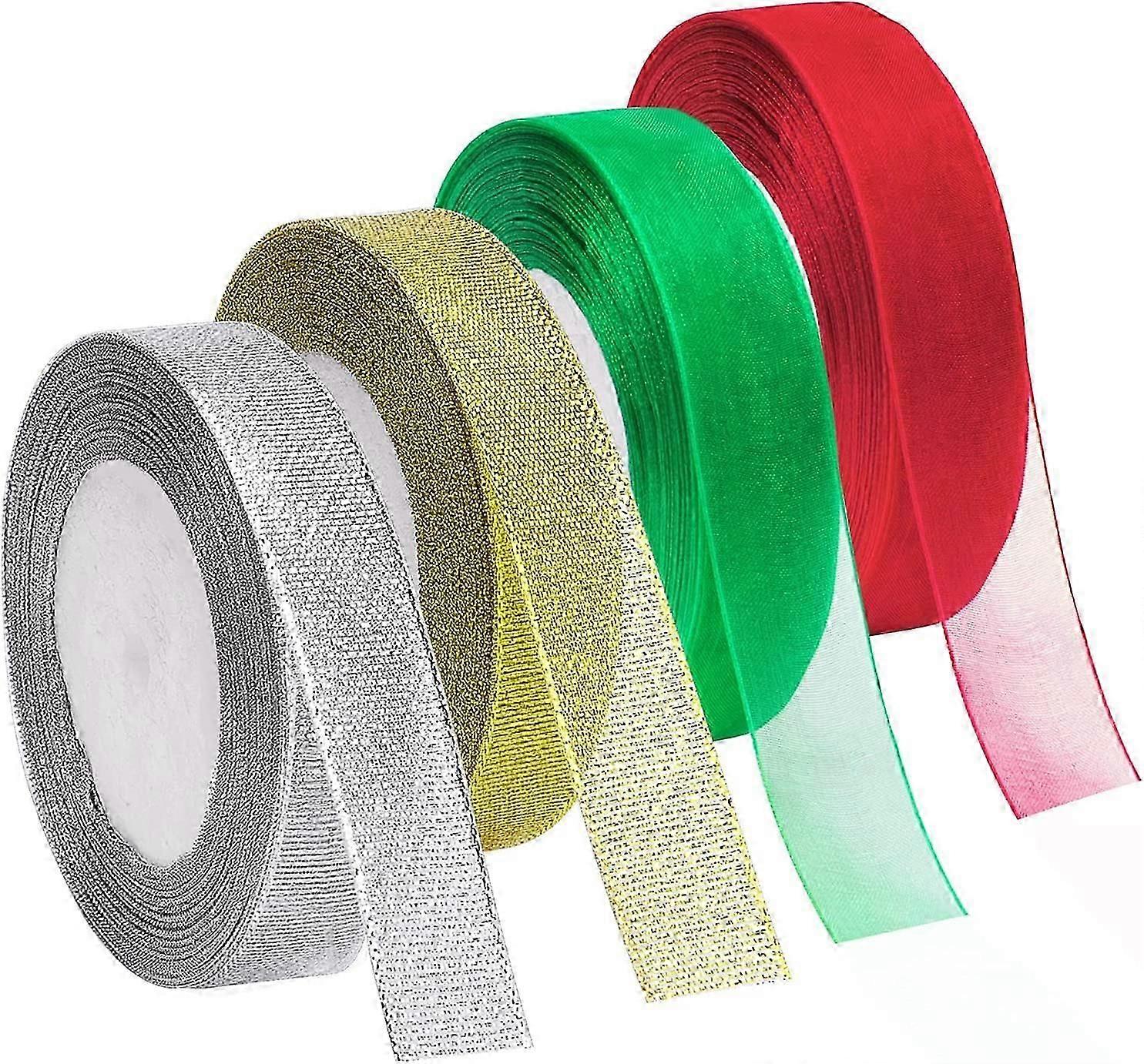 4 Rolls 4/5 Inch in Width Christmas Metallic Glitter Organza Ribbons Golden, Silvery, Red, Green Ribbon for Gift Wrapping, Christmas Tree Room Decorat