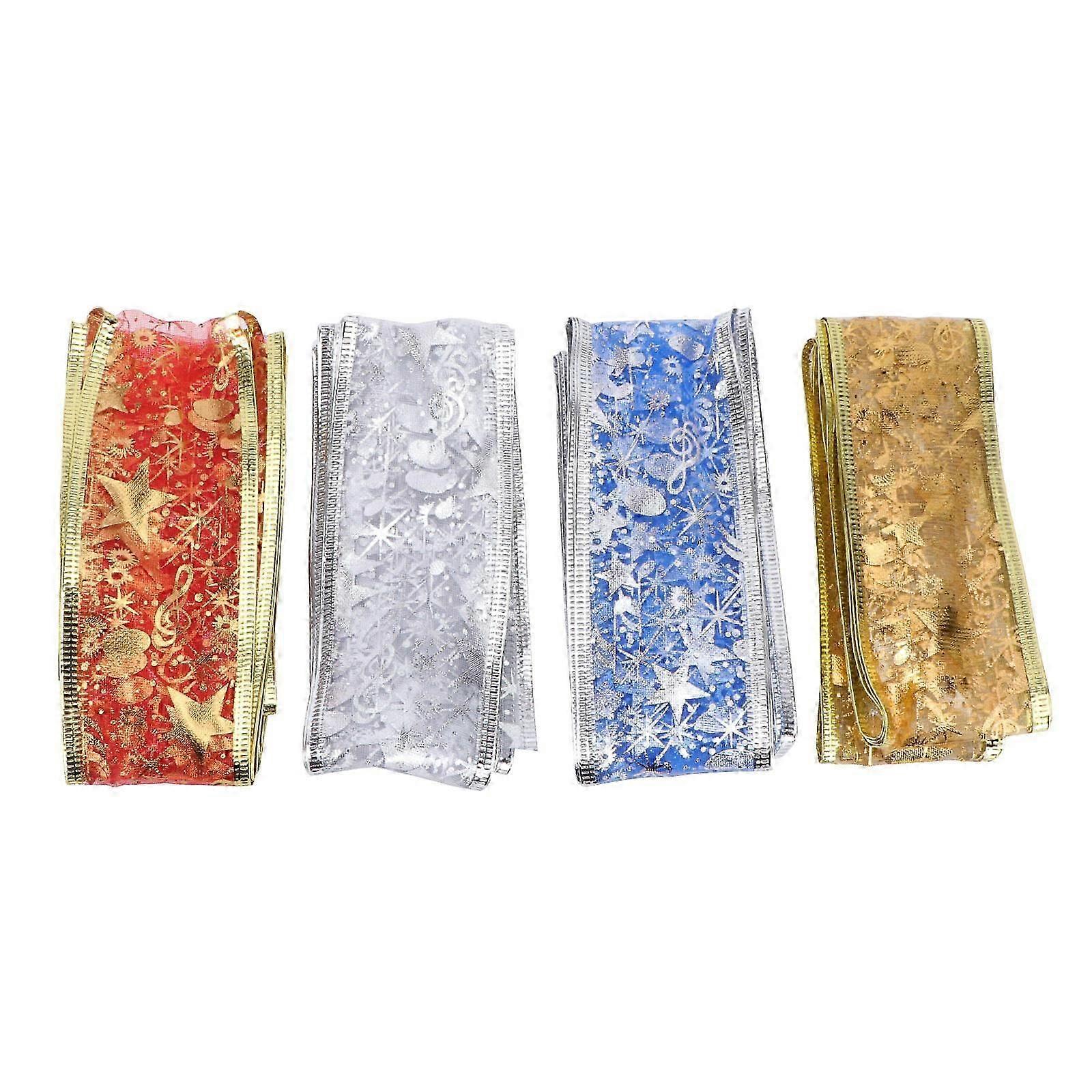 4 Rolls of 2cm Christmas Satin Ribbon Bronzing Pentagram Printed Xmas Silk Ribbon Decoration Gift Wrapping Ribbons (Red+Golden+Silver+Blue)