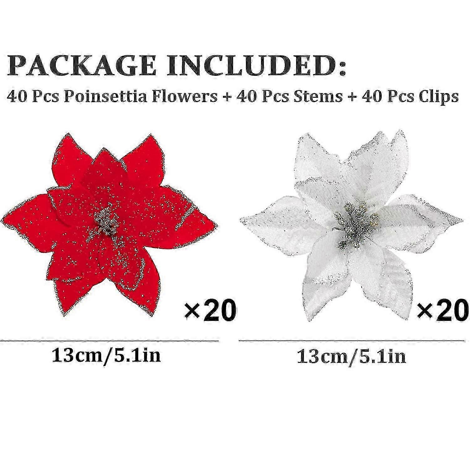 40pcs Poinsettia Faux Christmas Flowers Red Silver Christmas Flower Glitter
