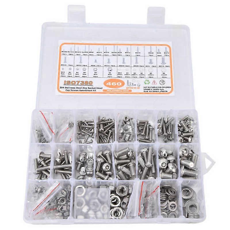 460 pcs. Hex Head Bolts Set 304 Stainless Steel Steel Bolt Nuts Washers Set For Home Furniture Feature:1. Basic specifications: Hex head bolts include 6 sizes of m2, 5, M3, M4, M5, M6 and M8, a total of 460 pieces, which can meet the needs of use2. Precision design: precision design, transparent thread, strong and pointed screw teeth, can be connected tightly, without the risk of loosening the fasteners3. Wide Application: These hex head screws are very useful parts for tools, if necessary, it can be used for household and office equipment, furniture and other machinery4. 304 stainless steel: made of 304 stainless steel, it has good rust resistance, corrosion resistance, strength and deformation resistance, and is durable5. Applications: Ideal tool for home and workplace, professionals, hobbyists, craftsmen, conservators, woodworking, construction, furniture, communication equipment, etc. Specification:Item Type: Hex Head Bolts Set Material: Stainless Steel 304Executiom Standard: ISO7380Model Bolt: M2. 5x8mm, M2.5x12mm, M2.5x16mm, M2.5x20mmM3x8mm, M3x12mm, M3x16mm, M3x20mmM4x8mm, M4x12mm, M4x16mm, M4x20mmM5x8mm, M5x12mm, M5x16mm, M5x20mmM6x8mm, M6x12mm, M6x16mm, M6x20mmM8x12mm, M8x16mmWorm ModelM2.5M3M4M5M6M8Thread Diameter (Approx)2.5mm / 0.10in3mm / 0.12in4mm / 0.16in5mm / 0.20in6mm / 0.24in8mm / 0.31inPitch (Approx)0.45mm / 0.02in0.5mm / 0.02in0.7mm / 0.03in0.8mm / 0..0 031in1mm / 0.04in1.25mm / 0.05inHead Diameter (Approx.) 4.5mm / 0.2in5.7mm / 0.22in7.5mm / 0.30in9.5mm / 0.37in10.5mm / 0.41in14mm / 0.55inHead Height (Approx.) 1.5mm / 0.06in1.65mm / 0.06in2.2mm / 0.12in2.75mm / 0.11in3.3mm / 0.13in4.4mm / 0.17inKey Size (Approx.) 1.5mm / 0.06in2mm / 0.08in2.5mm / 0.10in3mm / 0.12in4mm / 0.16in5mm / 0.20in Washer Model Thickness (Approx.) Inner Diameter (Approx.) M2.50.5mm / 0.02in2.7mm / 0.106in6mm / 0.24inM30.5mm / 0.02in3.2mm / 0.12in7mm / 0.27inM40.8mm / 0.031in4.3mm / 0.17in9mm / 0.35inM51mm / 0.04in5.3mm / 0.21in10mm / 0.40inM61.6mm / 0.06in6.4mm / 0.25in12mm / 0.47inM81.6mm / 0.06in8.4mm / 0.33in16mm / 0.63inHex Full Nut ModelThread Diameter (Approx.) Pitch (Approx.) Nut Height (Approx.) Wrench Diameter (Approx.) M2.52.5mm / 0.10in0.45mm / 0.02in2mm / 0.08in5mm / 0.20inM33mm / 0.12in0.5mm / 0. 02in2.4mm / 0.09in5.5mm / 0.22inM44mm / 0.16in0.7mm / 0.03in3.2mm / 0.12in7mm / 0.27inM55mm / 0.20in0.8mm / 0..20 031in4mm / 0.16in8mm / 0.31inM66mm / 0.24in1mm / 0.04in5mm / 0.20in10mm / 0.40inM88mm / 0.31in1.25mm / 0.05in6.5mm / 0.26in13mm / 0.51inPackage List:6 x Hex Wrench10 x M2.5x8mm Screw10 x M2.5x12mm Screw10 x M2.5x16mm Screw10 x M2.5x20mm Screw10 x M3x8mm Screw10 x M3x12mm Screw10 x M3x16mm Screw10 x M3x20mm Screw10 x M4x8mm Screw10 x M4x12mm Screw10 x M4x16mm Screw10 x M4x20mm screw10 x M5x8mm screw10 x M5x12mm screw10 x M5x16mm screw10 x M5x20mm screw10 x M6x8mm screw10 x M6x12mm screw10 x M6x16mm screw10 x M6x20mm screw10 x M8x12mm screw10 x M8x16mm screw20 x M2.5 washer20 x M3 washer20 x M4 washer20 x M5 washer20 x M6 washer20 x M8 washer20 x M2.5 nut20 x M3 nut20 x M4 nut20 x M5 nut20 x M6 nut20 x M8 nutUsage: Insert the screw into the right position, tighten the screw with a hex wrench and fix the parts, and very easy to use