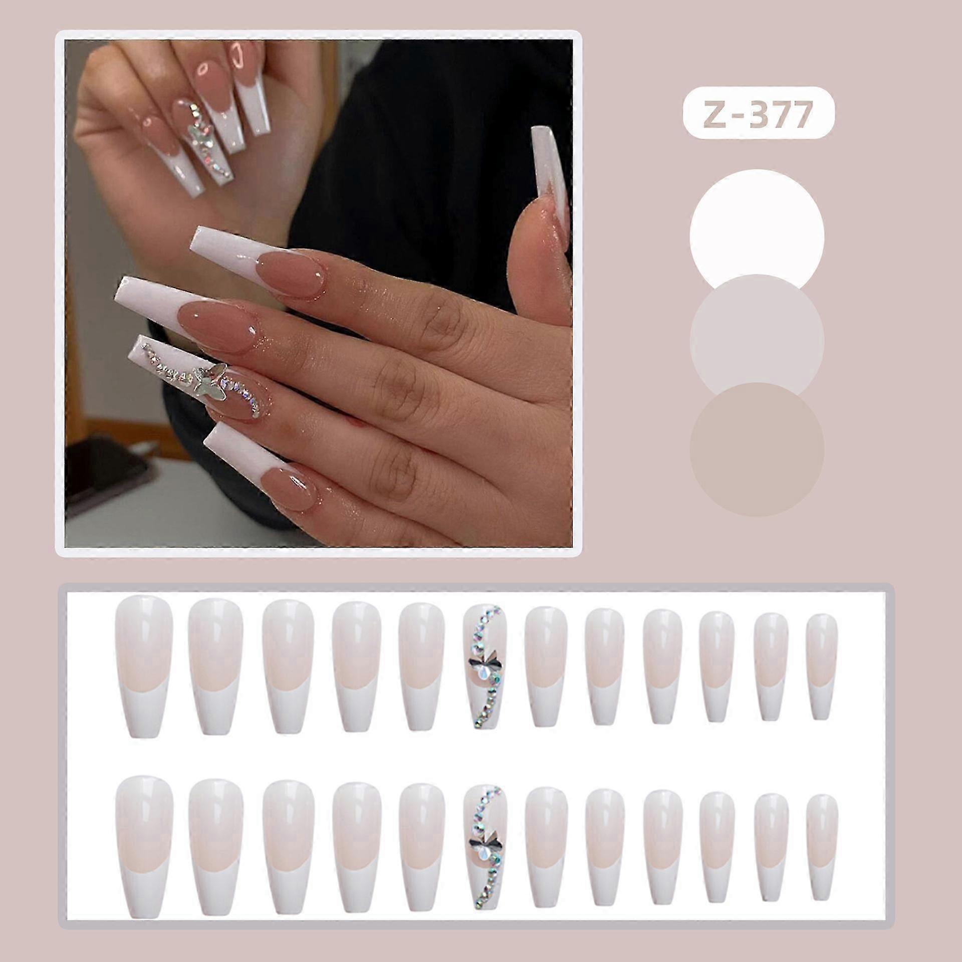 48 Pieces Bright Nude Long Press Rhinestone Design Nails, White French Coffin Acrylic Nail Press, Butterfly Crystal Pattern Women's Square Nail Nails,