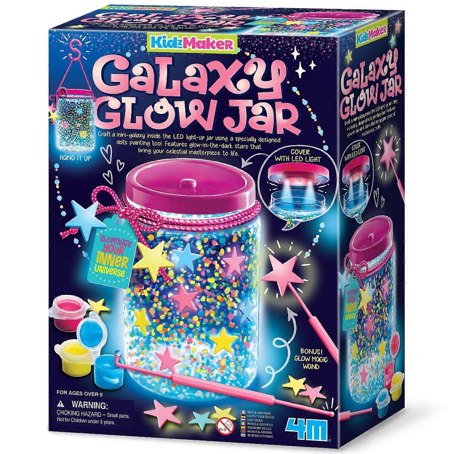 Illuminate your space and create a cozy ambiance with the magical, glowing LED jar of wonder. Create a magical ambiance with the Galaxy Glow Jar! This enchanting kit includes a durable 3.5-inch diameter, 5.5-inch tall jar, vibrant neon paints, and glow-in-the-dark stars for personalized creativity! With three vibrant neon fabric paints, children can create unique designs on the jar. A special two-headed painting tool allows for intricate patterns, especially at the bottom. Approximately 20 glow-in-the-dark stars add a magical, starry effect, and the jar transforms into a glowing wand when the stars are added. Personalization options include a decorative cord and tag for names or messages, making each jar unique. Easy-to-follow instructions ensure a smooth crafting experience, promoting creativity and imagination. This activity enhances fine motor skills and introduces basic concepts of light and design, supporting hands-on STEM learning. The Crafting Set includes a durable plastic jar, LED light cover, and batteries for instant illumination. With three vibrant neon fabric paints and a two-headed tool for intricate designs, children can create unique patterns.