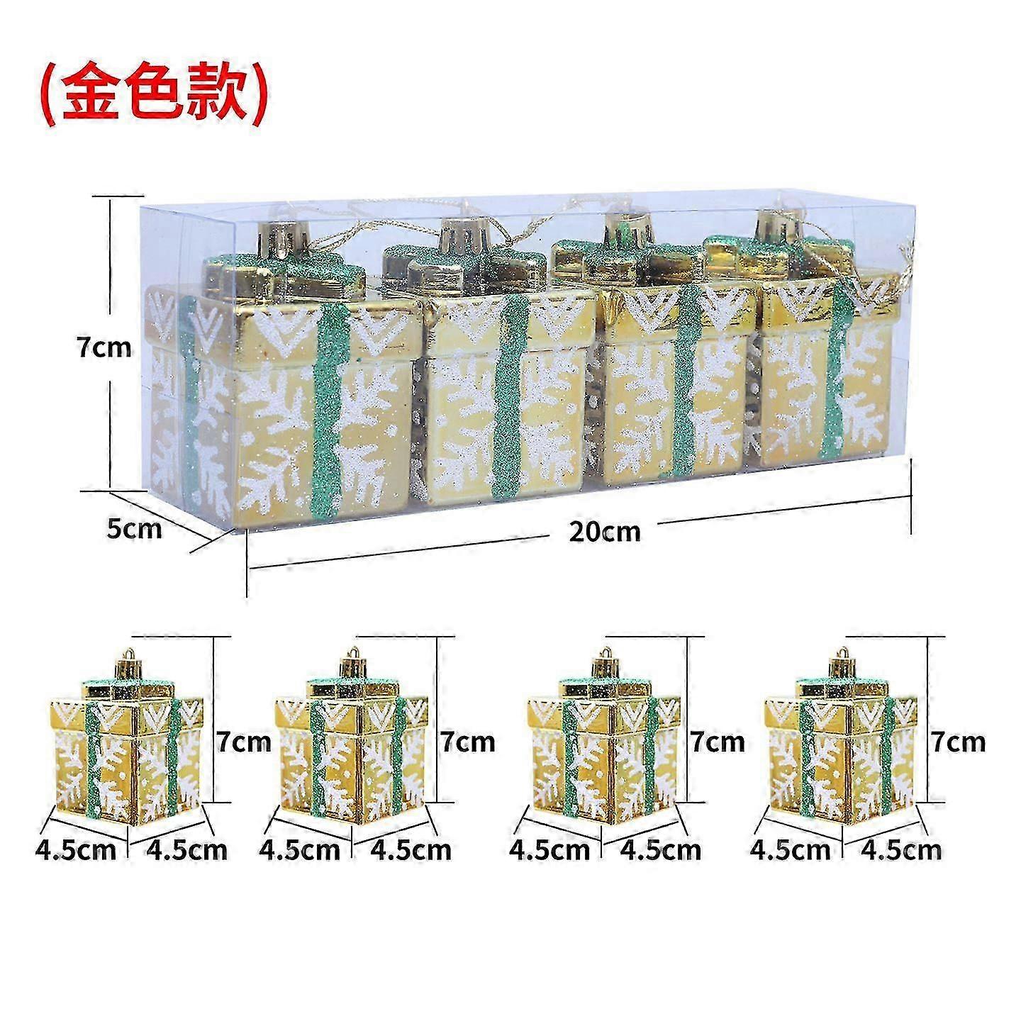 Description These beautifully hand-painted Christmas gift box ornaments are designed to bring a festive touch to your holiday decor. Featuring intricate details and vibrant colors, they are for hanging on Christmas trees, decorating shop windows, or enhancing the ambiance of holiday parties and gatherings. Features -Color:Golden-Material:Plastic-Size:6.00X4.50X4.50cm/2.36X1.77X1.77in-Festive design: handpainted christmas gift box ornaments bring a vibrant holiday atmosphere to your space, making it for celebrating the season.-Versatile usage: ideal for decorating christmas trees, windows, or commercial displays, these ornaments enhance the festive charm of any setting.-Giftable appeal: thoughtfully designed as both decor and a meaningful gift, these ornaments convey warm holiday wishes to friends and family.-sturdy material: crafted with faderesistant colors, these ornaments can be reused year after year, promoting sustainability and reducing waste.-Easy to hang: lightweight and convenient, these ornaments are simple to attach without damaging surfaces, ensuring easy holiday decoratingPackage list: 4 x Christmas decoration pendants