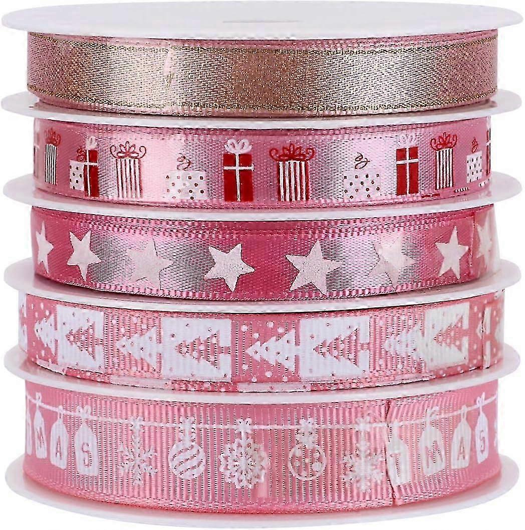 5 Rolls 25m Christmas Ribbon Mixed Pattern Christmas Printing Gift Box Ribbon DIY Craft Headband Ribbon for Home Store Pink