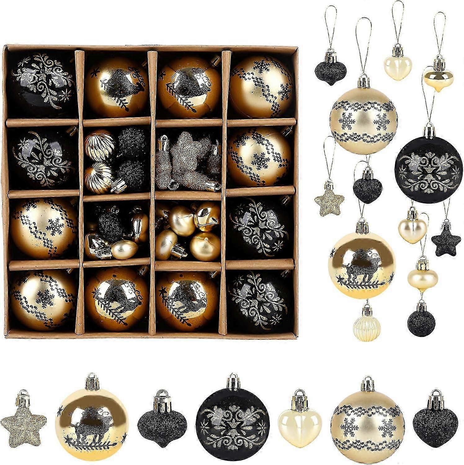 Package Dimensions:24.9 x 24.8 x 6.3 cm; 310 GramsMaterial:PolystyreneItem Weight:310 gBlack and Gold Christmas BallsProduct DetailsSize: 24.824.86cmWeight: 310kgMaterial: PSPieces: 52 piecesProduct Features1. Black and gold together, the colour is very nice, very design.2. The material is high quality, durable and wear-resistant, the colour is bright and not easy to fade. Christmas ball with a lanyard on the top, very convenient to use.3. Very rich in content and variety of styles, perfect for Christmas.Warm Tips.Because of manual measurement, the size may have a slight deviation.Due to the different light and mobile phone screen, the actual colour may be slightly different from the picture.Creative appearance: Our Christmas ball colours are in black and gold, with different appearance, very design, let you feel the strong Christmas atmosphere.High quality material: Christmas balls are made of high quality PS material, durable and wear-resistant, sturdy and shatterproof, not easy to fade and can be used repeatedly.Convenient to carry: The size of the Christmas ball set is 24.8 x 24.8 x 6cm, each Christmas ball comes with a hanging rope, not easy to fall off. Weighing only 310g, it is easy to carry.Rich content: The Christmas ball set contains a total of 52 Christmas balls, a total of 13 styles, you can freely match them according to your preferences.Perfect christmas supplies: Christmas balls are perfect for Christmas decoration, you can use them with your family and friends.Creative appearance: Our Christmas ball colours are in black and gold, with different appearance, very design, let you feel the strong Christmas atmosphere.High quality material: Christmas balls are made of high quality PS material, durable and wear-resistant, sturdy and shatterproof, not easy to fade and can be used repeatedly.Convenient to carry: The size of the Christmas ball set is 24.8 x 24.8 x 6cm, each Christmas ball comes with a hanging rope, not easy to fall off. Weighing only 310g, it is easy to carry.Rich content: The Christmas ball set contains a total of 52 Christmas balls, a total of 13 styles, you can freely match them according to your preferences.Perfect christmas supplies: Christmas balls are perfect for Christmas decoration, you can use them with your family and friends.