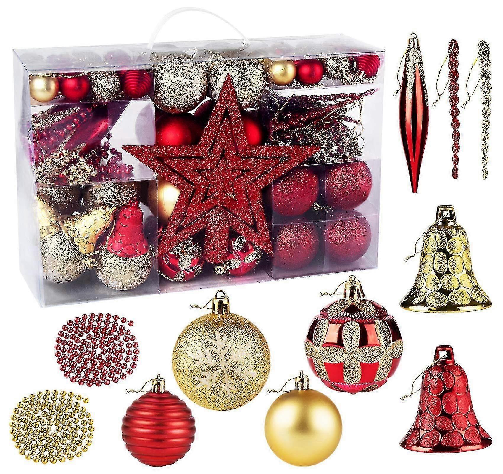 57+1 piece set for Christmas: including different size Christmas balls, ice cream cone, bell, bead necklace, cone pendant, star on top of the tree. Various sizes: 6cm and 3cm Christmas balls, 5cm bell, 2.5m bead necklace. A variety of colors and patterns: consisting of red and gold, including shiny, matte and glitter. EASY TO INSTALL, SAFE TO USE: Each ball decoration comes with a detachable rope to make it easy to use. Compared with glass balls, these ornaments are made of high-quality and environmentally friendly plastic which is not easy to break and is not harmful to children and pets. Perfect for Christmas: 57+1 glittering decorations decorate your Christmas tree beautifully and brilliantly and accompany you and your family in a warm Christmas party. < /p>