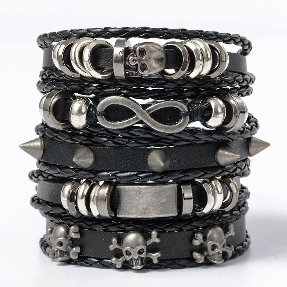 5pcs Metal Braided Punk Bracelet Set With Pu Leather & Beads