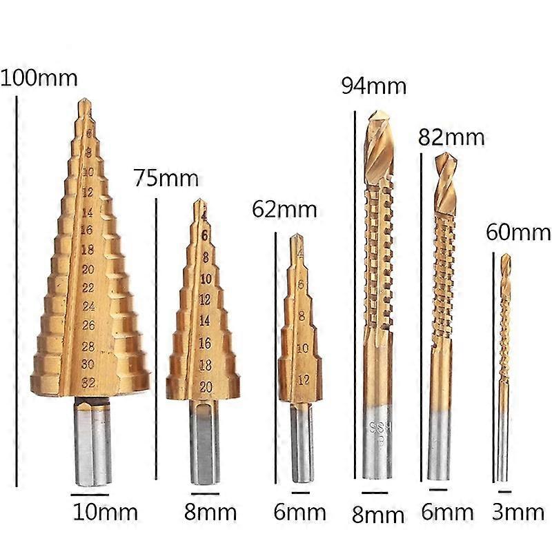 6Pcs Drill Bits High Speed Steel Wood Hole Cutter Tapered Drill Bit 4-12 4-20 4-32 Titanium Coated Step Drill Bit Drilling Power Tools