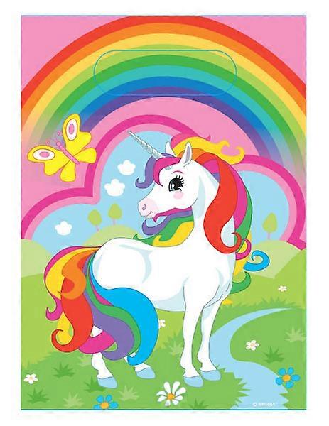 colorful birthday in the land of unicorns This set is made up of 8 plastic bags. Each one is printed with a pretty unicorn in a thousand colors in the middle of a meadow, under a rainbow Its 23 x 16 cm format will be perfect for holding treats and gifts to offer to your little guests.     Organize a colorful birthday in the land of unicorns for the happiness of your daughter and her friends. Accessories included: 8 Plastic bags Material: Plastic