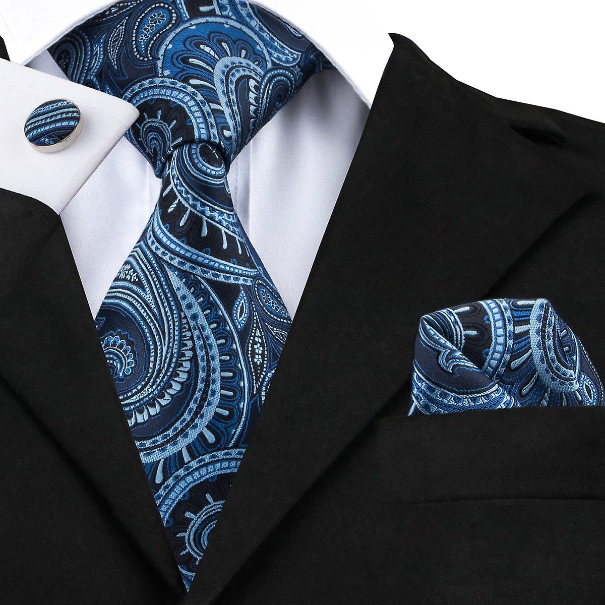 8.5cm Silk Men's Fashion Blue Paisley Tie Necktie Handkerchief Cufflinks Set