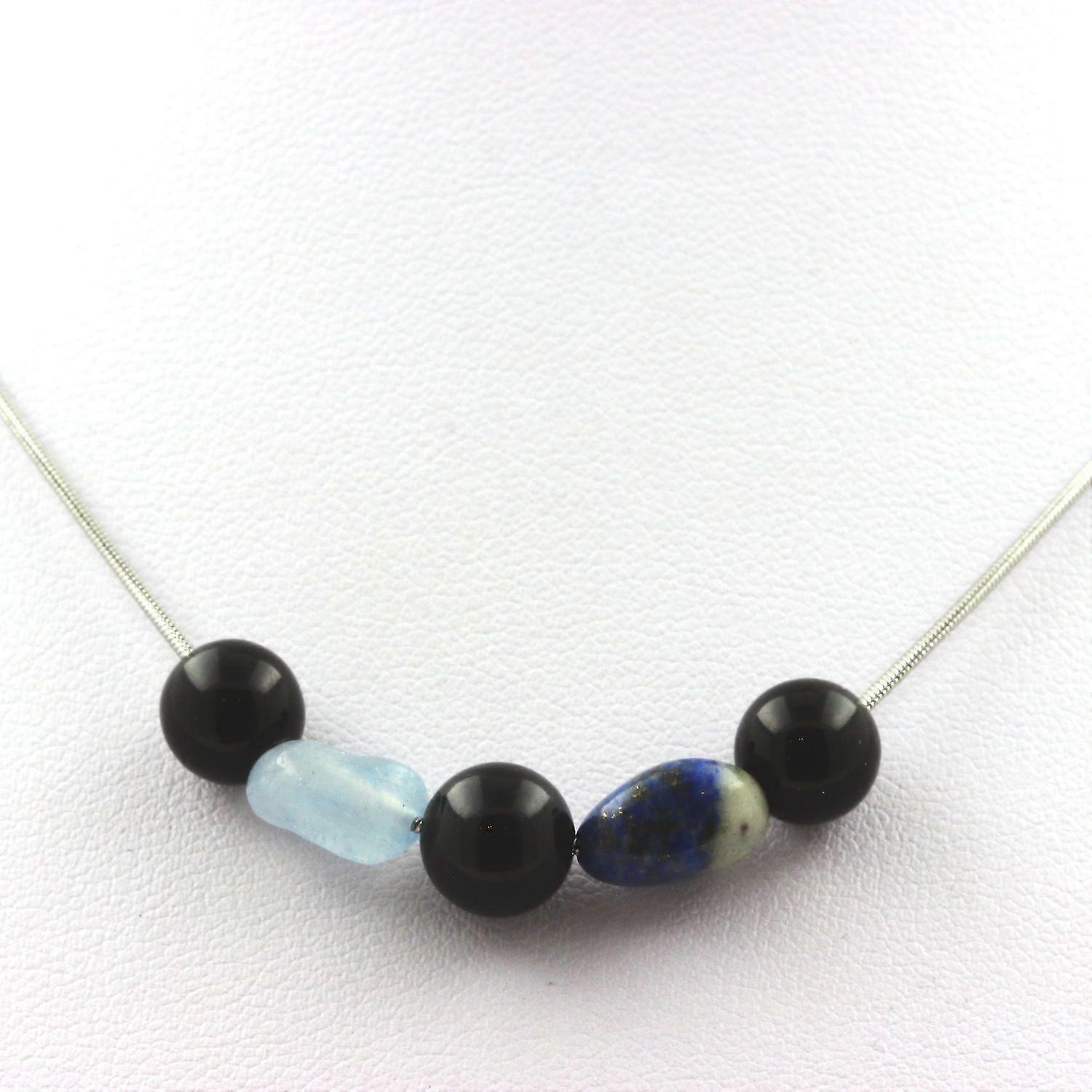 8mm Black Agate Beaded Necklace + Aquamarine from Brazil + Lapis Lazuli from Pakistan