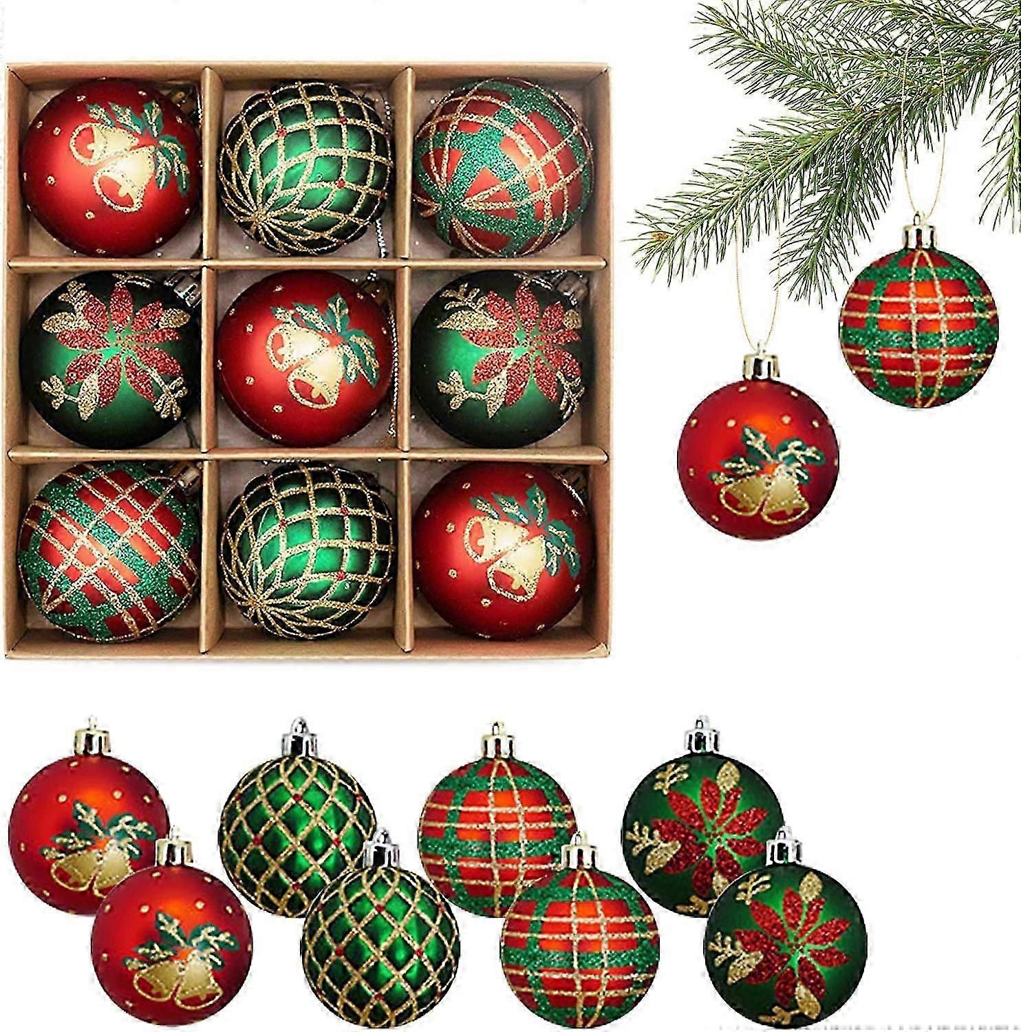 Model Number:Christmas Baubles DColour:Red and GreenProduct Dimensions:18 x 18 x 6 cm; 180 GramsMaterial:PVCItem Weight:180 gChristmas Baubles,60mm Christmas Ball Ornaments Decor for xmas Tree Shatterproof Balls Hanging Ball Ornaments with Hanging Loop Products details: Name:Christmas Baubles Material:PVC Color:Gold/Red/Silver/White/Green Size:60mm(as the pictures shown) Quantity:9 Pieces Products features: 1.Quality material,safe and reusable,don't need worry about the glass fragments hurt your and child hands 2.Perfect for xmas trees,wedding,shopping malls decoration and window displays ect 3.A hanging ring on the top of the ball and with hanging rope,easy to use 4.Tree balls with light weight and won't weigh down the Christmas tree branches 5.Printed with Christmas motifs,make your tree sparkle and shine this Christmas Package includes: 9 x Christmas Baubles Note: Product size is manually measured, please allow a small error of 0.1-0.3 cm60mm Christmas BaublesYou will get 9pcs Christmas baubles ornaments in 4 styles.gold,red,green,silver,white five colors for your choice,and each balls diameter is 60mm,large sizs,enough to meet your Xmas trees decor.Quality materialOur Christmas ball hanging ornaments made of quality pvc,safe and durable,will not be broken and deformed,shiny design,makes it look more delicate.reusable.Wide usageThe Xmas shatterproof balls ornaments widely used in Christmas and holiday and more Seasonal Decorative,perfect for Xmas trees,wedding,shopping malls decoration and window displays ect.Easy to useThere is a hanging ring on the top of the ball,and with hanging ropes,hang it up in the window or Christmas tree.easy to hang on and use.Perfect Xmas decorationThese beautiful baubles will make your tree sparkle and shine this Christmas,tree balls with light weight and won't weigh down the Christmas tree branches.perfect for Xmas decoration.60mm Christmas BaublesYou will get 9pcs Christmas baubles ornaments in 4 styles.gold,red,green,silver,white five colors for your choice,and each balls diameter is 60mm,large sizs,enough to meet your Xmas trees decor.Quality materialOur Christmas ball hanging ornaments made of quality pvc,safe and durable,will not be broken and deformed,shiny design,makes it look more delicate.reusable.Wide usageThe Xmas shatterproof balls ornaments widely used in Christmas and holiday and more Seasonal Decorative,perfect for Xmas trees,wedding,shopping malls decoration and window displays ect.Easy to useThere is a hanging ring on the top of the ball,and with hanging ropes,hang it up in the window or Christmas tree.easy to hang on and use.Perfect Xmas decorationThese beautiful baubles will make your tree sparkle and shine this Christmas,tree balls with light weight and won't weigh down the Christmas tree branches.perfect for Xmas decoration.