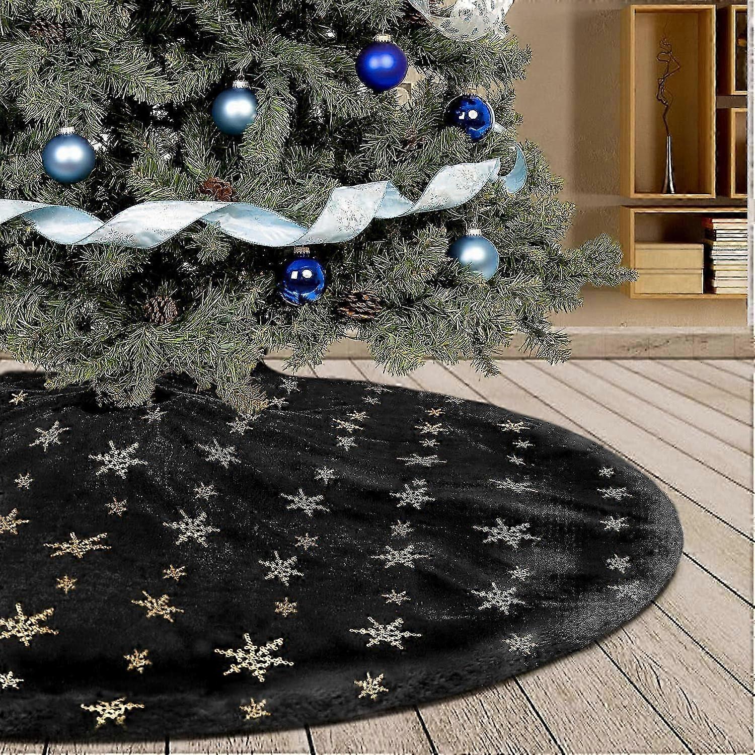 90cm Plush Black Christmas Tree Skirt with Gold Snowflakes Sequin Christmas Tree Stand Cover Fur Shine Christmas Tree Skirt Carpet for Christmas Tree