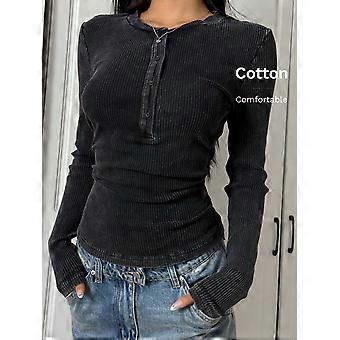 95% Cotton Black Casual Long Sleeve Fitted Button-Up Tight Fit Long T-Shirt Set, Suitable For Autumn & Winter , Vintage, Cute Summer Tops, Softgirl,Ho