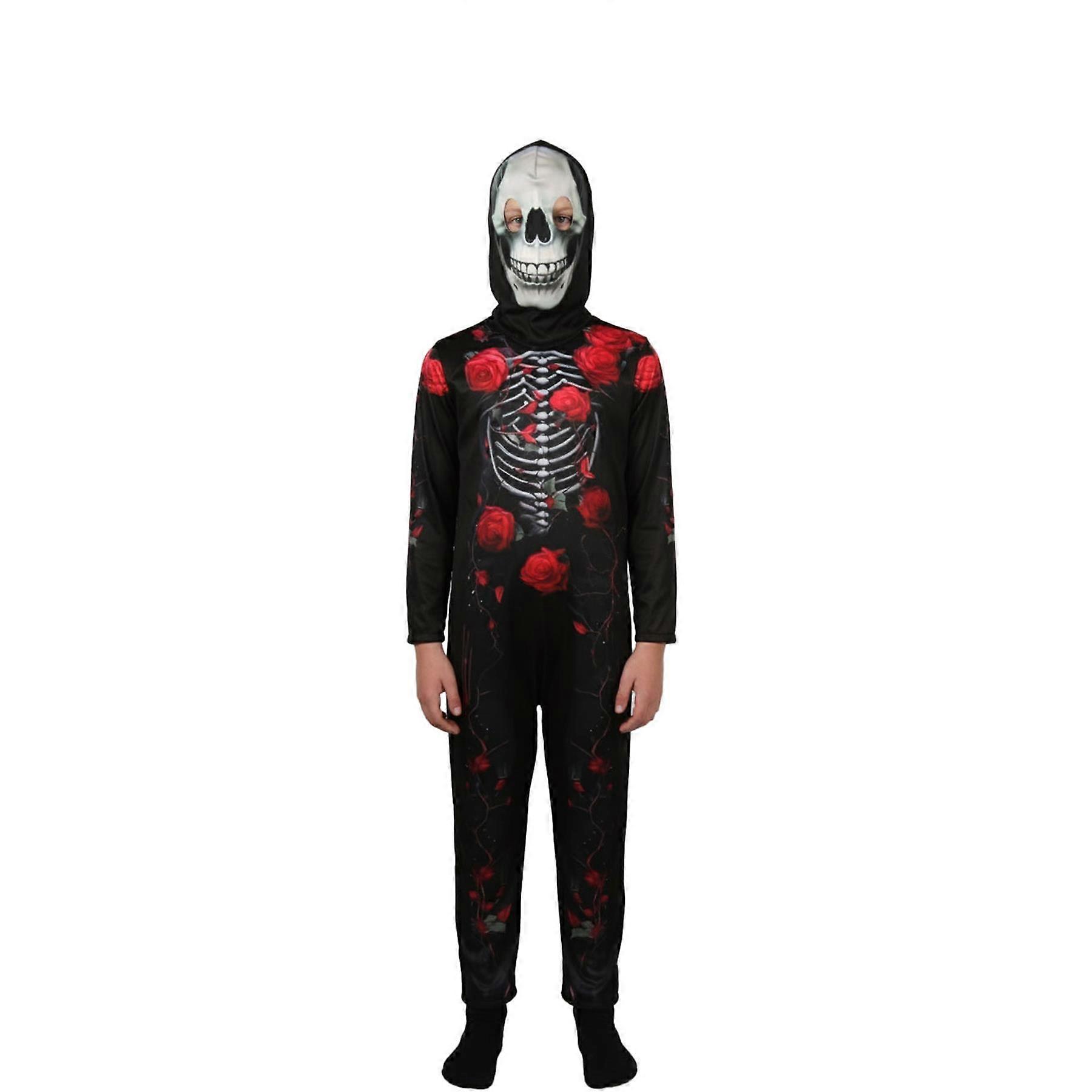 SPOOKY DESIGN AND OCCASIONS:This kids rose skeleton costume features a chilling black jumpsuit with red rose skeleton print and a built-in skull hood mask. Perfect for Halloween, trick-or-treating, school events and fancy dress parties, it ensures your child stands out with a strikingly spooky look for a memorable fright night.COMFORTABLE MATERIAL:Crafted from 100% polyester fabric, this costume is soft, lightweight and breathable. The flexible design allows kids to enjoy hours of fun while playing, dancing, or trick-or-treating. Smooth fabric feels comfortable against the skin, making it easy to wear for longer occasions without irritation.EASY FUNCTIONALITY:Designed as a convenient one-piece jumpsuit with Velcro fastening at the back, this costume is quick and simple to put on and remove. The hood with attached skull face mask completes the scary look instantly, eliminating the need for extra accessories and saving time when dressing up.SAFETY ASSURED:This rose skeleton fancy dress is CE/UKCA tested to meet UK safety standards, giving parents confidence in quality. Not suitable for children under 3 years due to small parts presenting a choking hazard. Made with durable stitching to withstand play, offering both spooky style and peace of mind.COLOUR, SIZES AND GIFT IDEA:Available in black with red rose skeleton print for a unique and dramatic effect. Offered in children’s sizes 3-5, 6-8, 9-11 and 12-14 years, making it suitable for a wide age range. A fun and frightening gift choice for kids who love dressing up, horror costumes and Halloween fun.