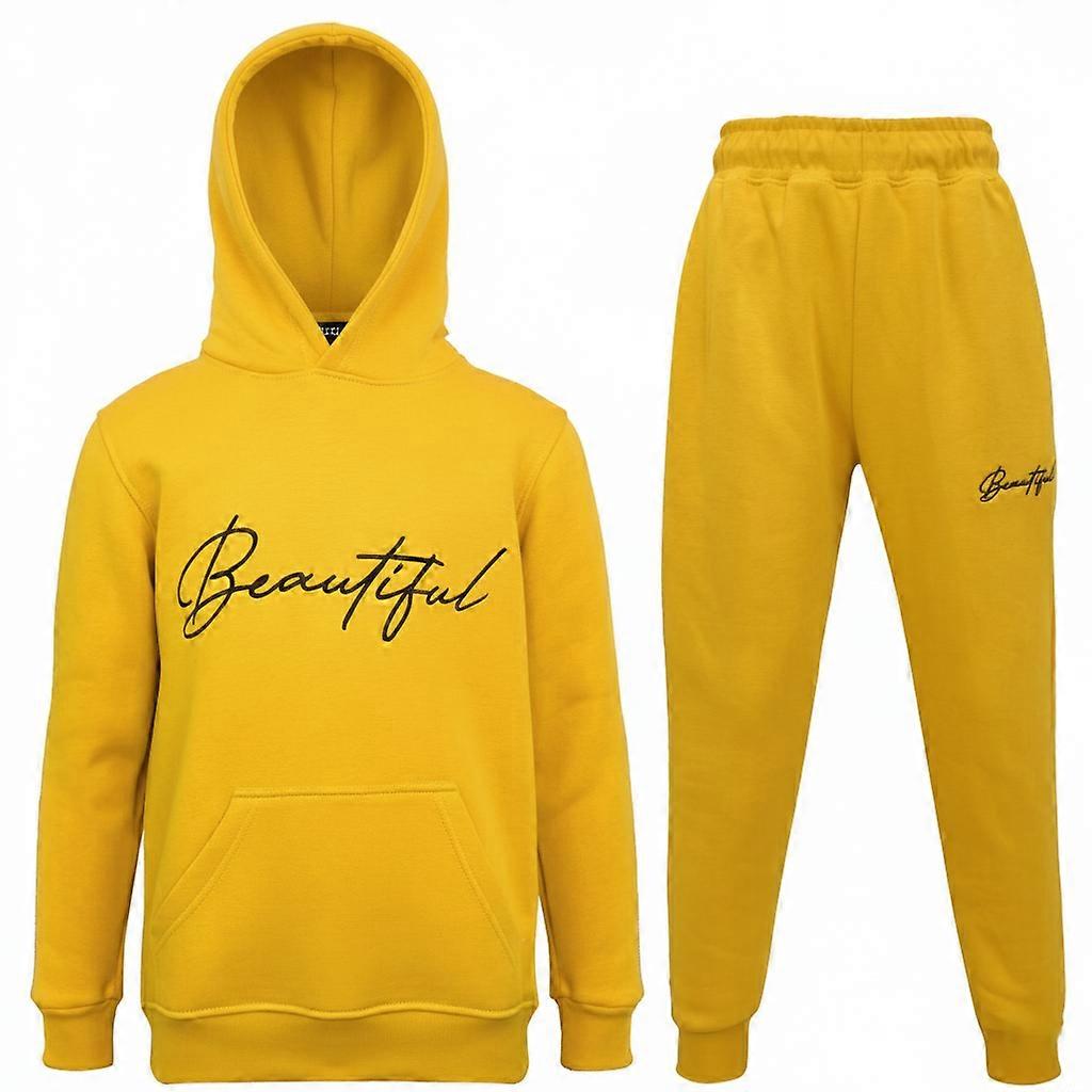 COMFORTABLE:Thoughtfully designed, this 2-piece set includes a long-sleeve top and joggers, making it ideal for wear in any weather rainy, windy, or sunny. Perfect for activities like walking, jogging, gym workouts, or cardio, it offers unmatched versatility indoors and outdoors. The lightweight fleece fabric ensures cosy warmth on cooler days while remaining breathable and non-restrictive for maximum comfort.HIGH-QUALITY MATERIAL:This tracksuit is crafted from a premium blend of 65% cotton and 35% polyester, offering excellent flexibility and durability. It is manufactured using high-quality materials, ensuring long-lasting wear. The polyester-blend fleece fabric provides a soft, breathable feel, keeping your child comfortable and cool.COMFORTABLE: The jacket has a Full Sleeves easy wear, a hood for added protection, ribbed cuffs and a waist for a secure fit. Two practical cross pockets provide space for essentials or hand warmth. The joggers feature an elastic waistband with an adjustable drawstring for a tailored fit and ribbed ankle cuffs to keep them in place during active use. This set seamlessly combines style and practicality.CLASSIC COLORS AND SIZE FOR EVERY OCCASION: This tracksuit is available in a versatile Mustard shade that complements any setting, from casual outings to sporty activities. Offered in a range of sizes—3-4 years, 5-6 years, 7-8 years, 9-10 years, 11-12 years, and 13 years, it provides the perfect fit for kids of all ages, effortlessly blending comfort, style, and practicality.IDEAL:With its trendy Beautiful print, this tracksuit is stylish and functional. Ideal for running, jogging, or casual outings, it offers a lightweight yet cosy feel with its breathable fleece material. Designed for relaxing at home or staying active, it ensures durability and modern style for any occasion.