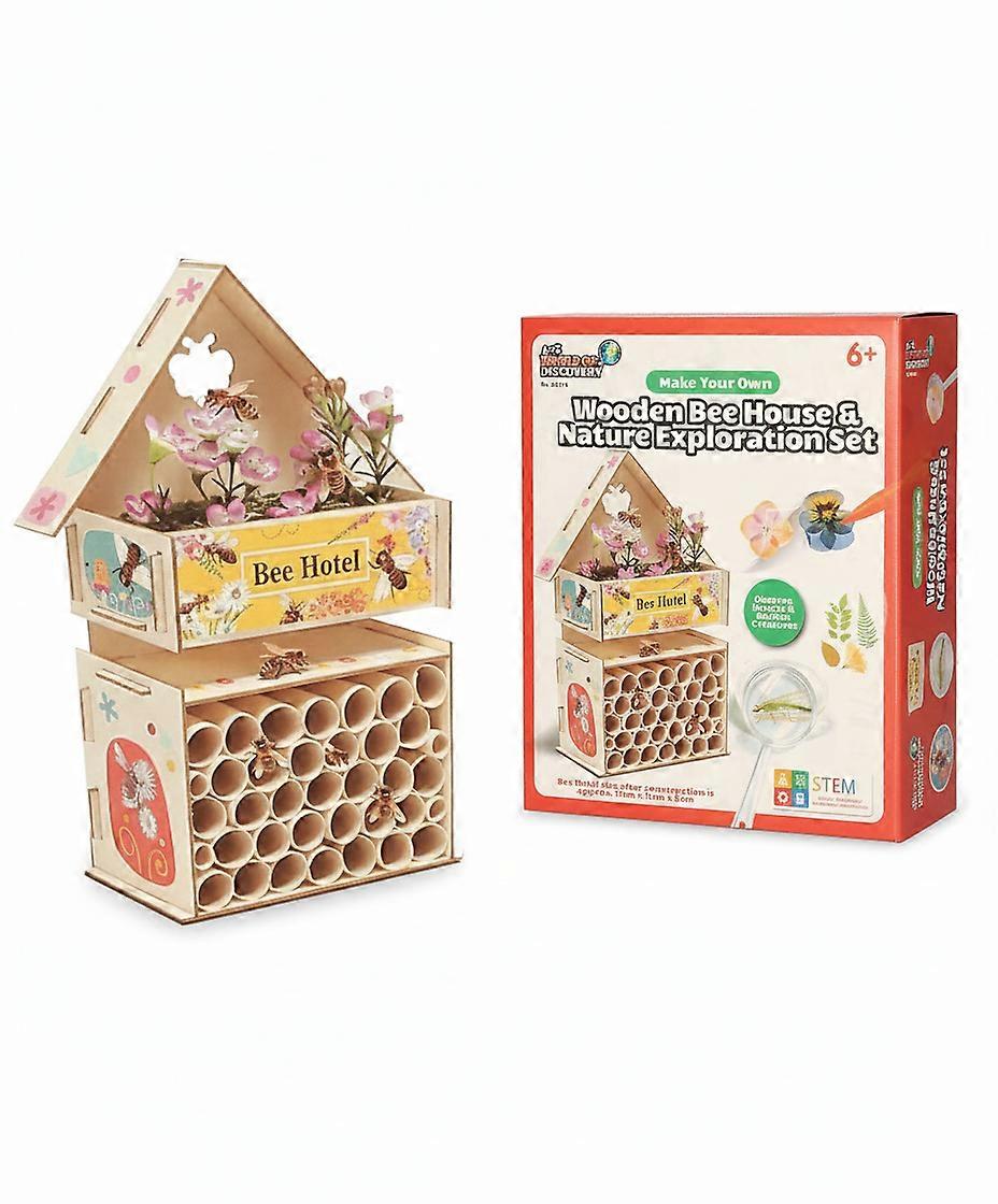 EDUCATIONAL STEM GARDEN FUN:Encourage curiosity and creativity with this make your own wooden bee house kit. Designed for children aged 6+, this engaging STEM activity introduces young explorers to the importance of pollinators while promoting hands-on learning. Ideal for garden projects, school activities or weekend craft sessions at home.PREMIUM NATURAL WOOD MATERIAL:Crafted from smooth, child-friendly natural wood, this bee hotel kit is sturdy and easy to assemble. The pre-cut panels and wooden tubes fit securely together, helping children develop fine motor skills while building a safe habitat for garden bees and beneficial insects.ENCOURAGES OUTDOOR DISCOVERY:Turn your garden into a nature exploration zone. This bee house provides a safe resting and nesting spot for solitary bees, helping children observe insects up close. A wonderful way to promote outdoor play, environmental awareness and respect for wildlife.EASY TO ASSEMBLE DESIGN:The set includes pre-cut wooden panels, tubes and decorative stickers for a personalised finish. Simple slot-together construction makes it suitable for young builders with adult supervision. Once assembled, it can be placed in the garden, balcony or outdoor learning area.PERFECT GIFT FOR YOUNG NATURE LOVERS:Finished in a natural wood colour with charming bee-themed prints, this creative kit makes a thoughtful gift for birthdays, Christmas or school projects. Suitable for boys and girls aged 6 years and above who enjoy crafts, gardening and discovering the natural world.